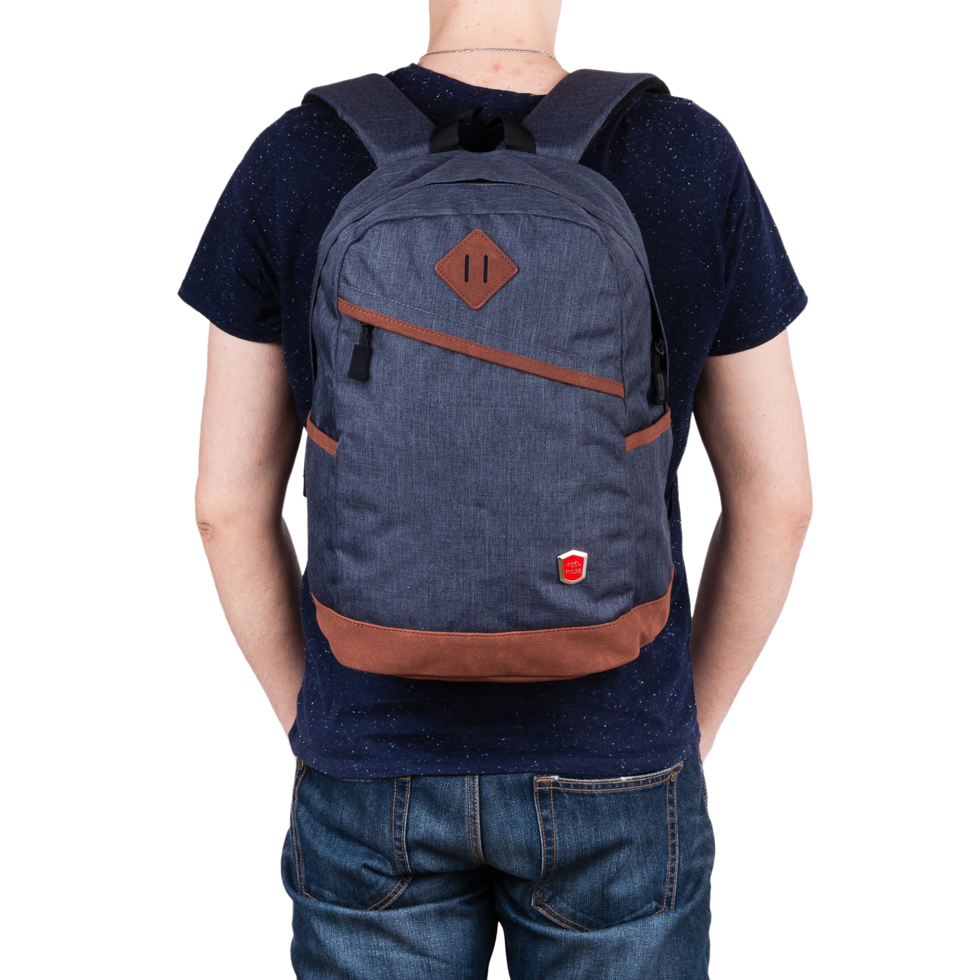 Городской рюкзак Polar прекрасно подходит для повседневной носки. Основное отделение застёгивается на молнию  чёрного цвета. Внутри рюкзака есть открытое  отделение для планшета  и документов в формате A4 , а также маленький карман на молнии. Спереди рюкзака расположен вместительный карман с молнией по диагонали и фирменным логотипом. На рюкзаке присутствует нашивка в форме ромба с двумя вертикальными прорезями. По бокам расположены небольшие открытые карманы. Лямки мягкие, с поролоновыми вставками, внизу регулировочные бретели. Края карманов и дно обработаны кожаными вставками.