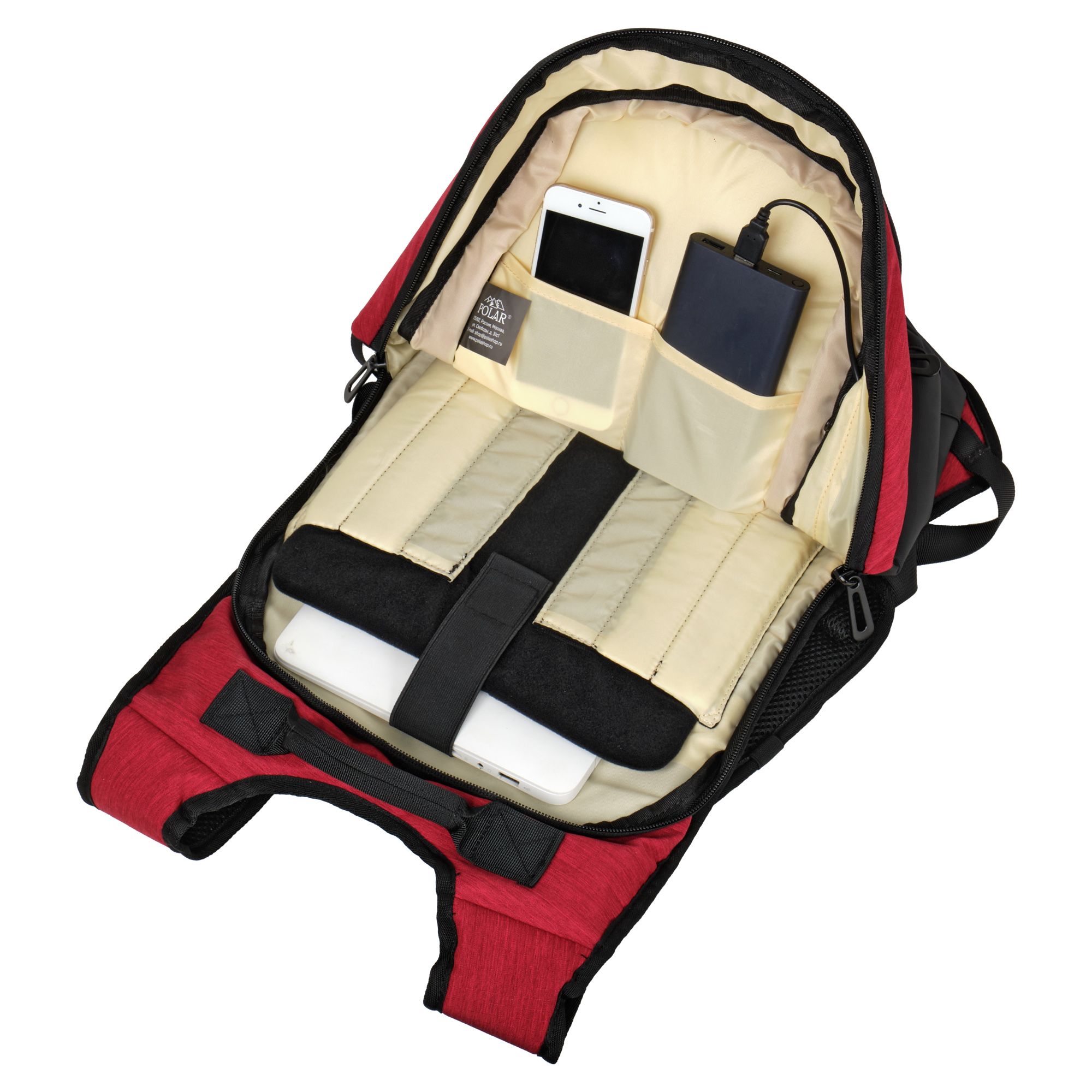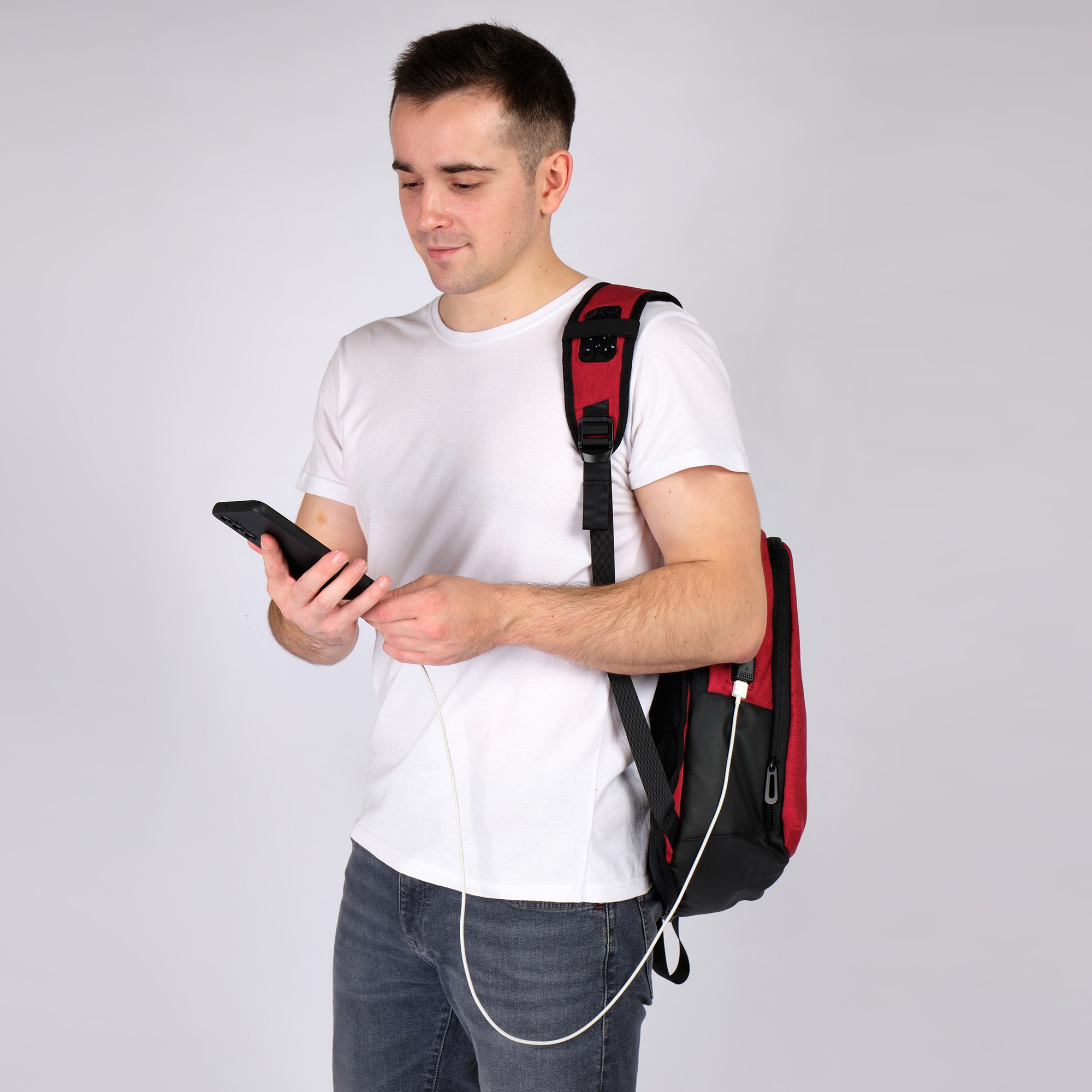 USB–порт для зарядки, позволит зарядить телефон не снимая рюкзак, что особенно удобно в современном мире. На левой лямке расположены присоски и резинка, которые надежно удерживают телефон во время подзарядки и освобождают руки.