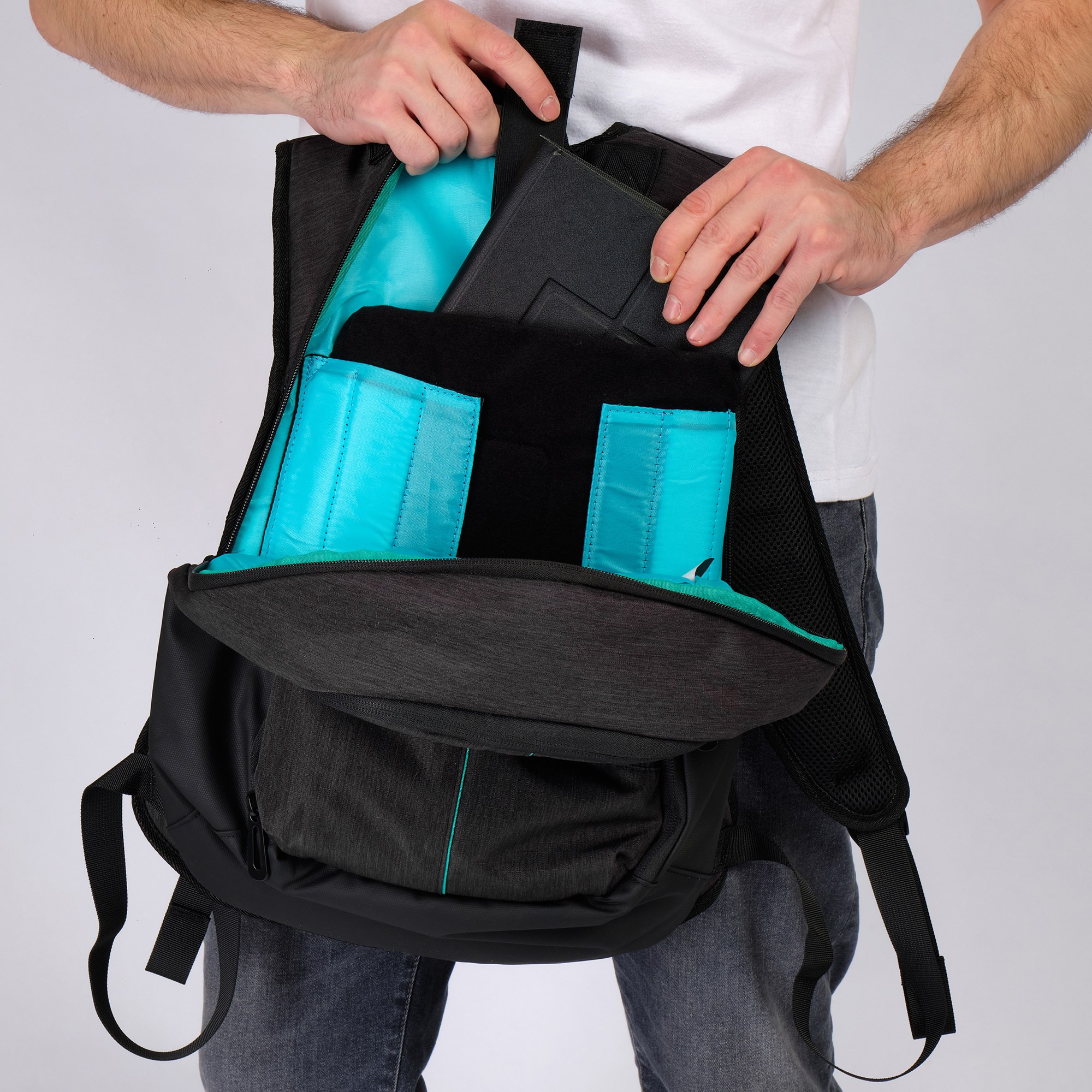 Внутри рюкзака на задней стенке  отделение для ноутбука, которое при помощи липучек –фиксаторов может менять размер, в зависимости от диагонали вашего гаджета.