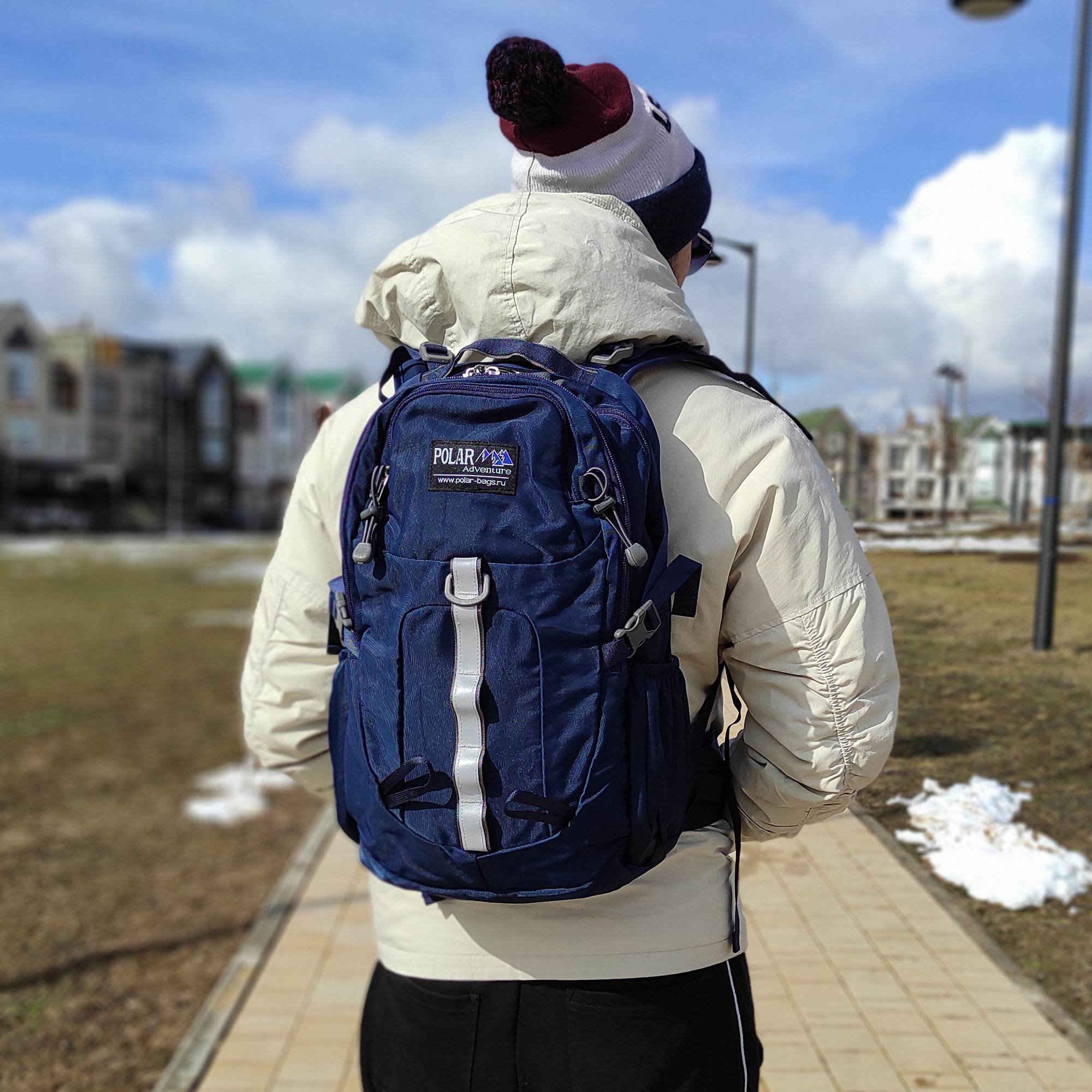Основное отделение на молнии с большим карманом на резинке. Второе отделение с вместительным сетчатым карманом. Спереди небольшой карман на молнии для мелочей. По бокам располагаются открытые карманы на резинке. Спинка жесткая, имеет вставки из пены для лучшего воздухообмена. Мягкий набедренный пояс с карманом на молнии. Наплечные ремни анатомической формы не натирают плечи, регулируются по длине. Удобная ручка для переноски. Боковыми и нагрудными стяжками регулируется его объем.