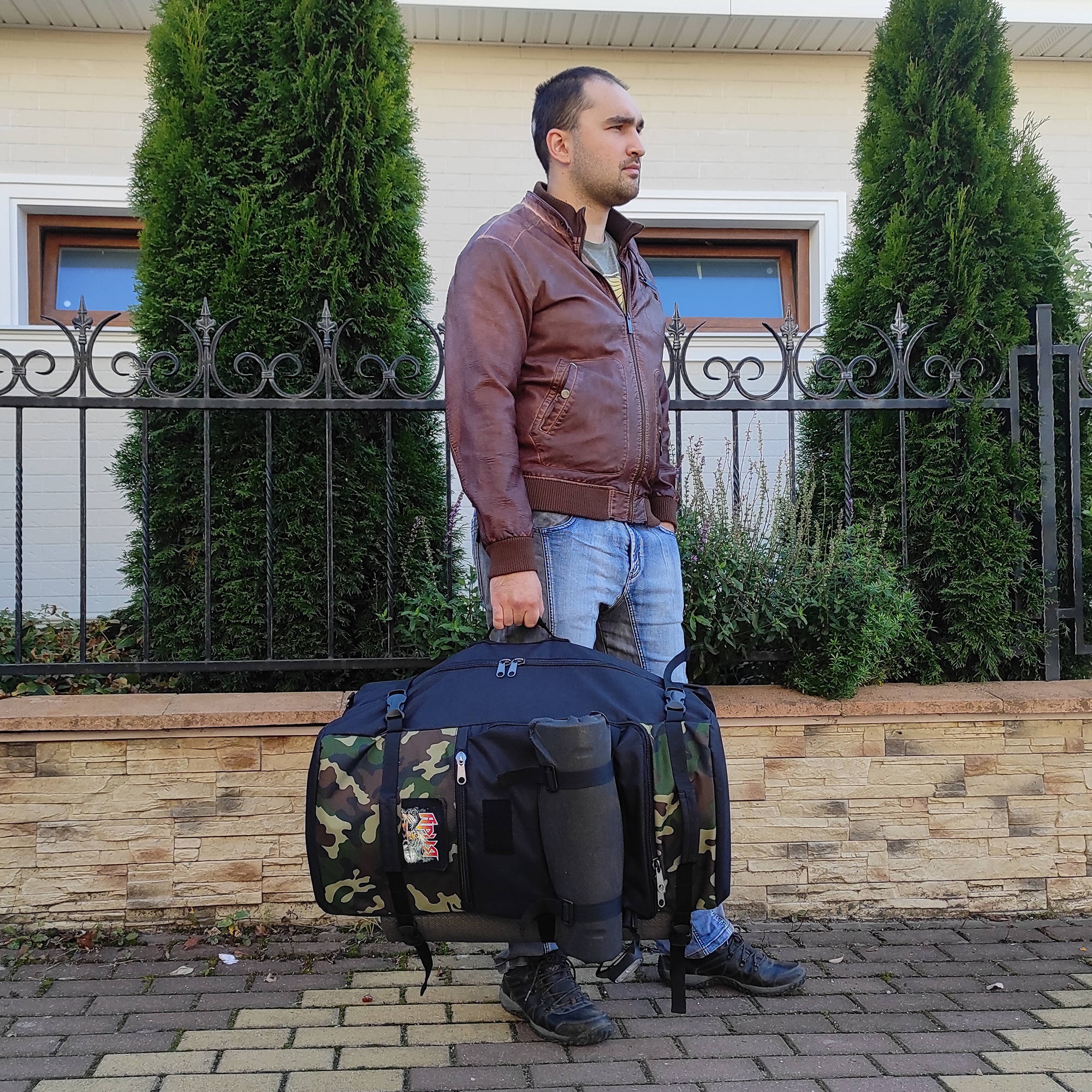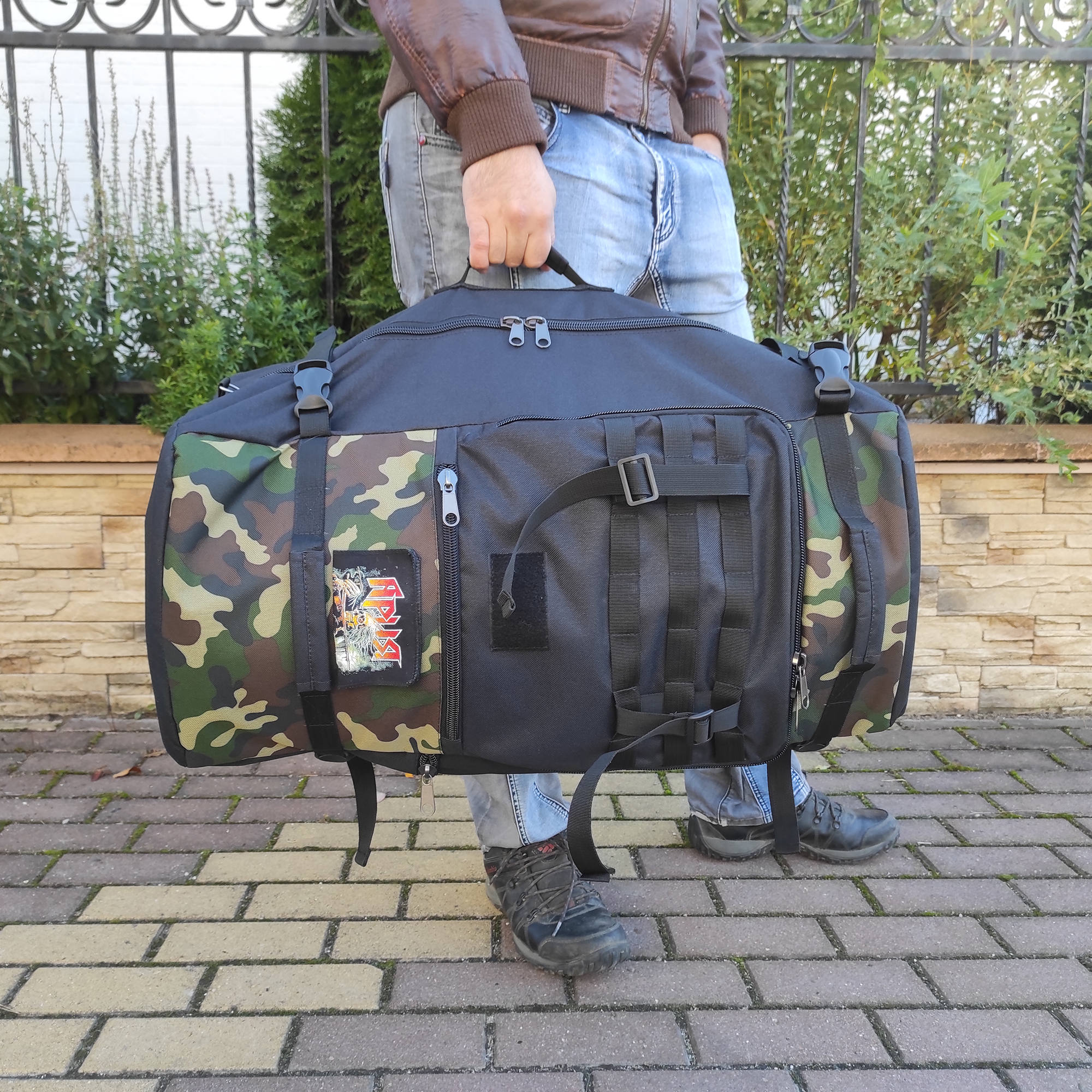 При необходимости, рюкзак легко трансформируется в большую дорожную сумку, если взять его за боковую ручку длина и убрать лямки под дополнительное отделение, отстегнув его сверху и закрыв на молнию. В комплекте есть съемный, регулируемый по длине ремень, длина до 125 см.