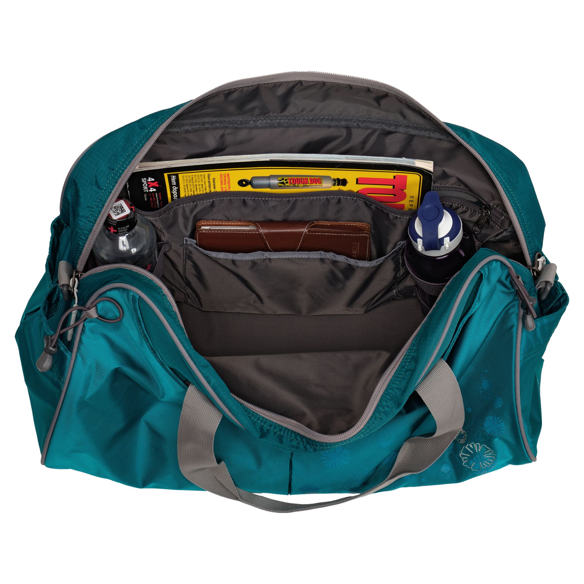 Вместительная спортивная сумка выполнена из нейлона. Одно основное отделение. Внутри карман на молнии, открытый кармашек на липучке, держатель для бутылочки с водой. Снаружи- карман на молнии спереди сумки. Имеется плечевой ремень.