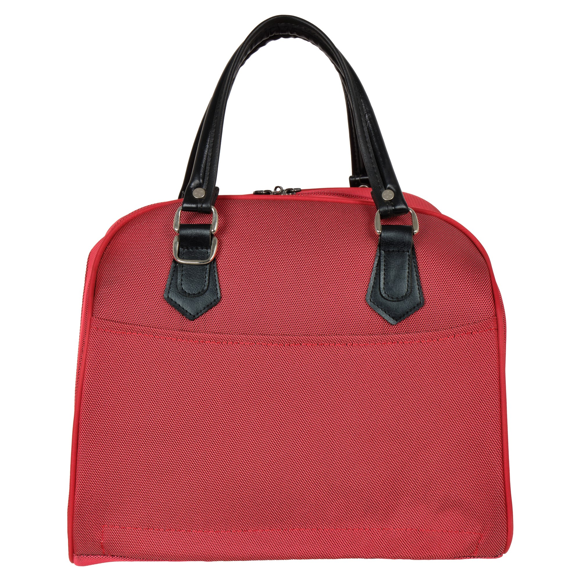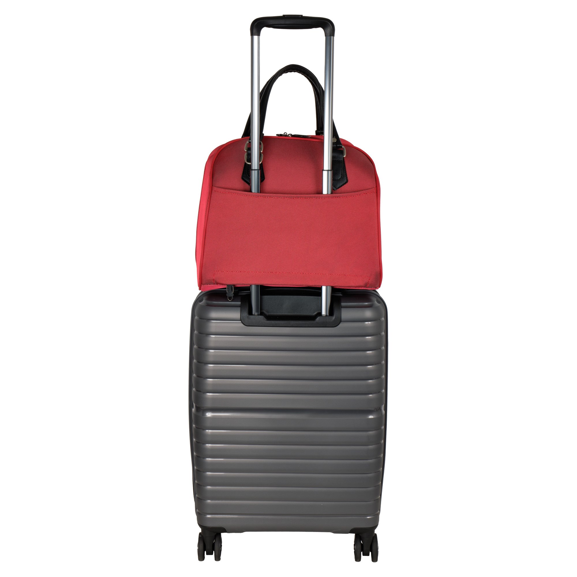 На задней стенке сумки предусмотрено крепление на ручку чемодана, но если вы застегнете молнию, то получите дополнительный карман.