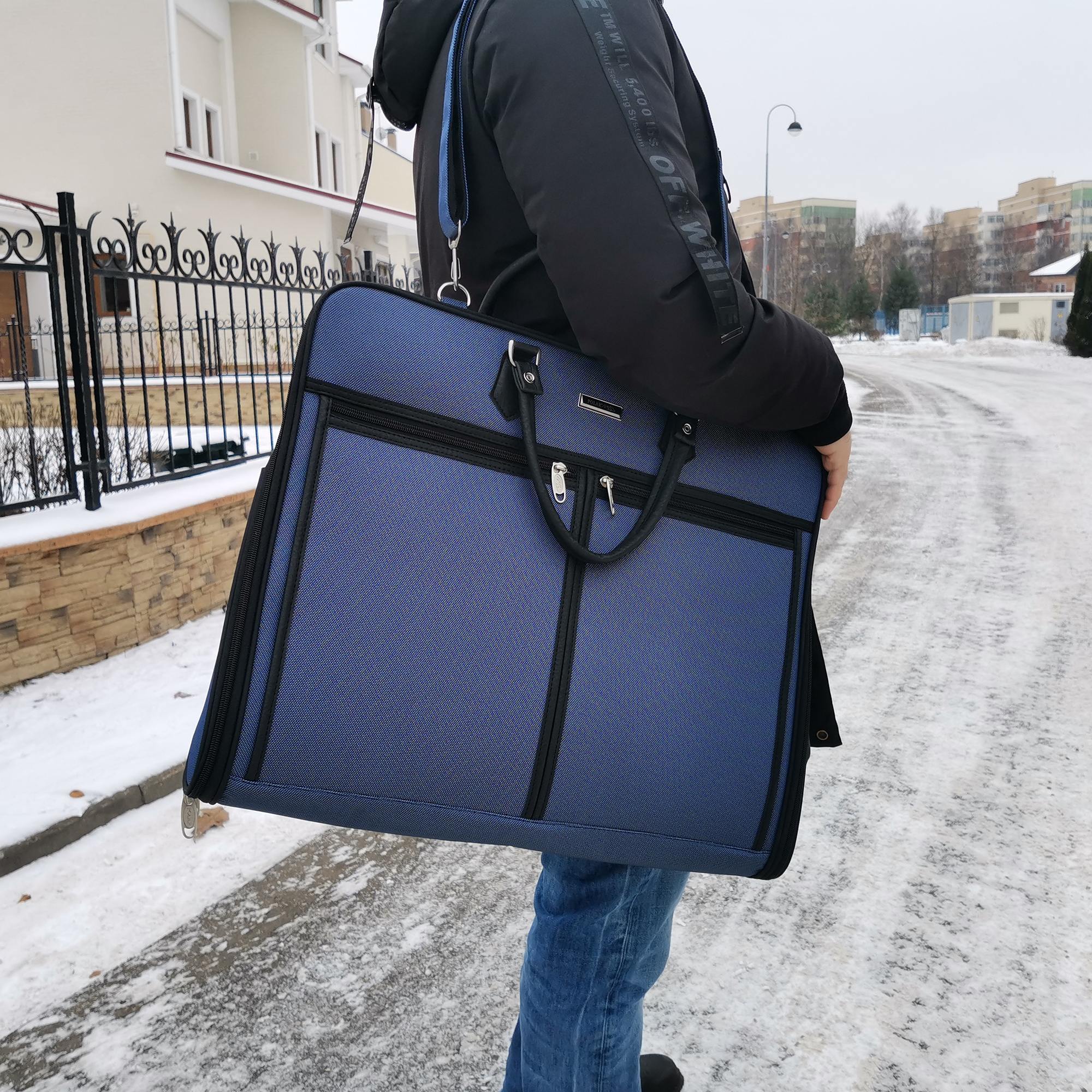 Тонкий портплед на молнии. Удобен для перевозки личных вещей в коротких поездках или командировках. Основной отдел в форме чехла с петлей для  вешалки. Дополнительно внутри два кармана. Снаружи на передней части расположены два больших кармана на молнии, сзади один большой карман на молнии. Портплед снабжен съемным плечевым ремнем. Вешалка в комплект не входит.
