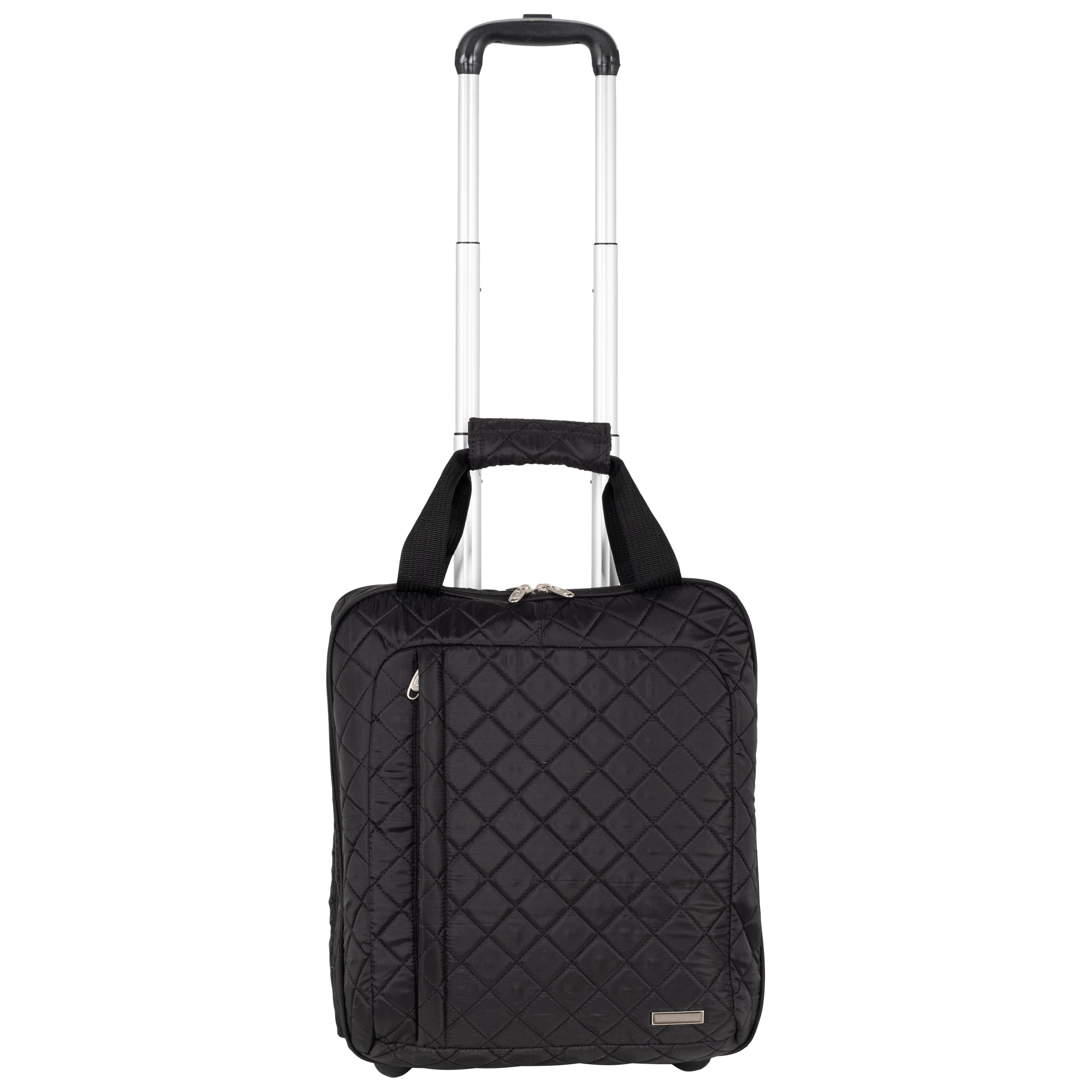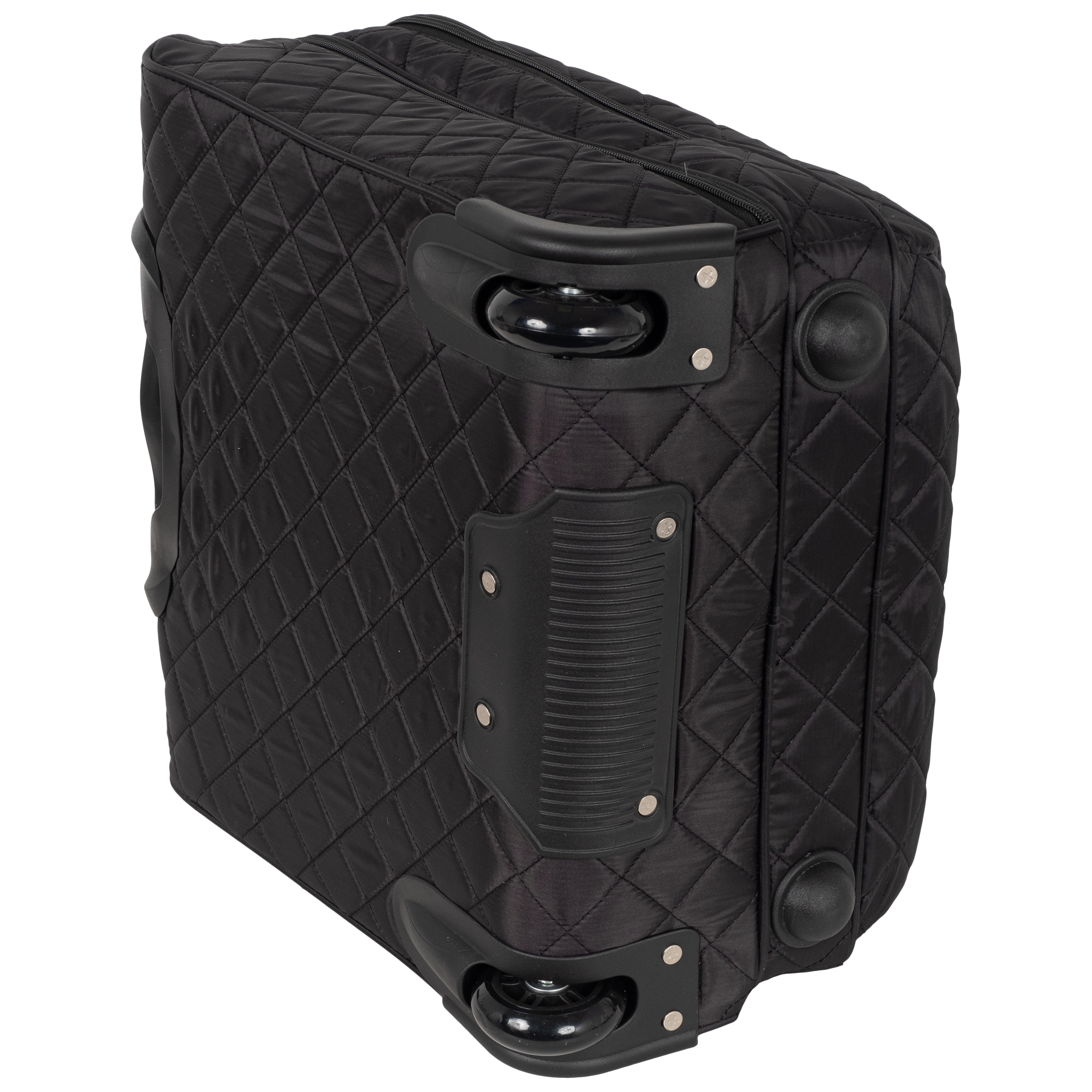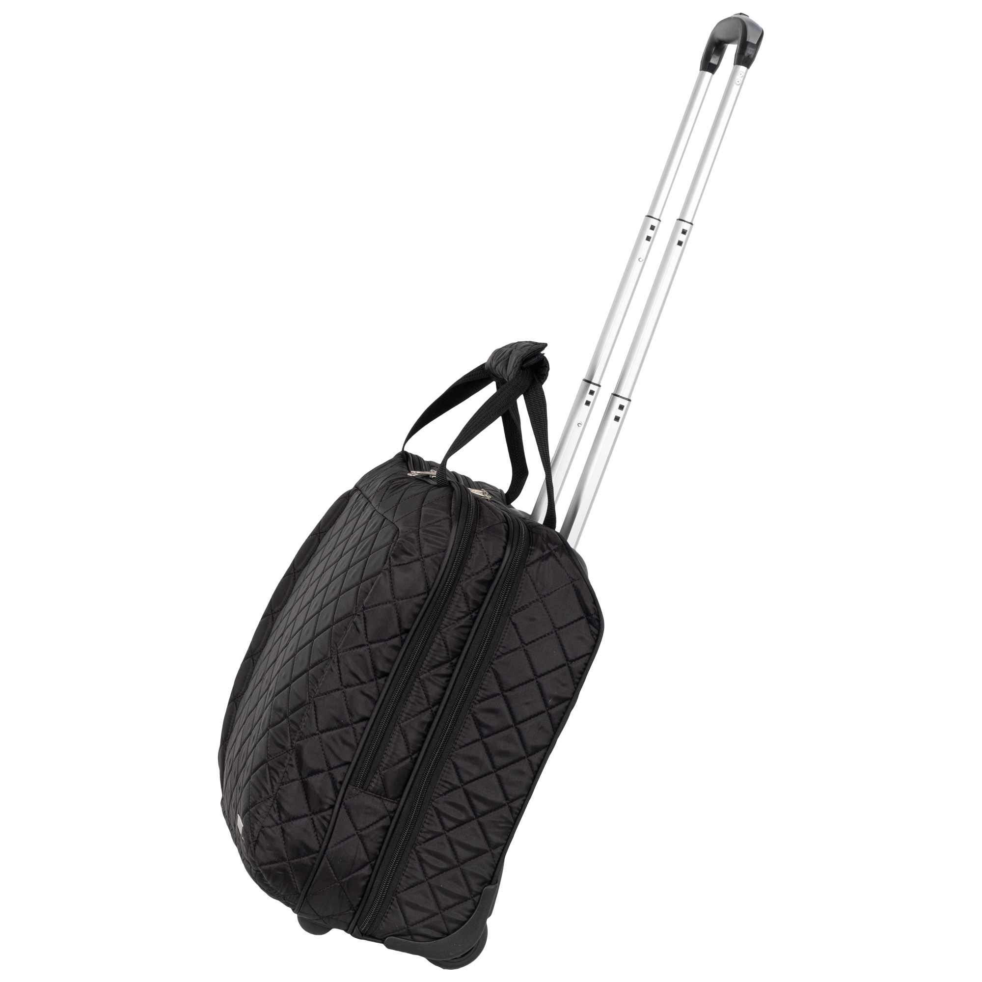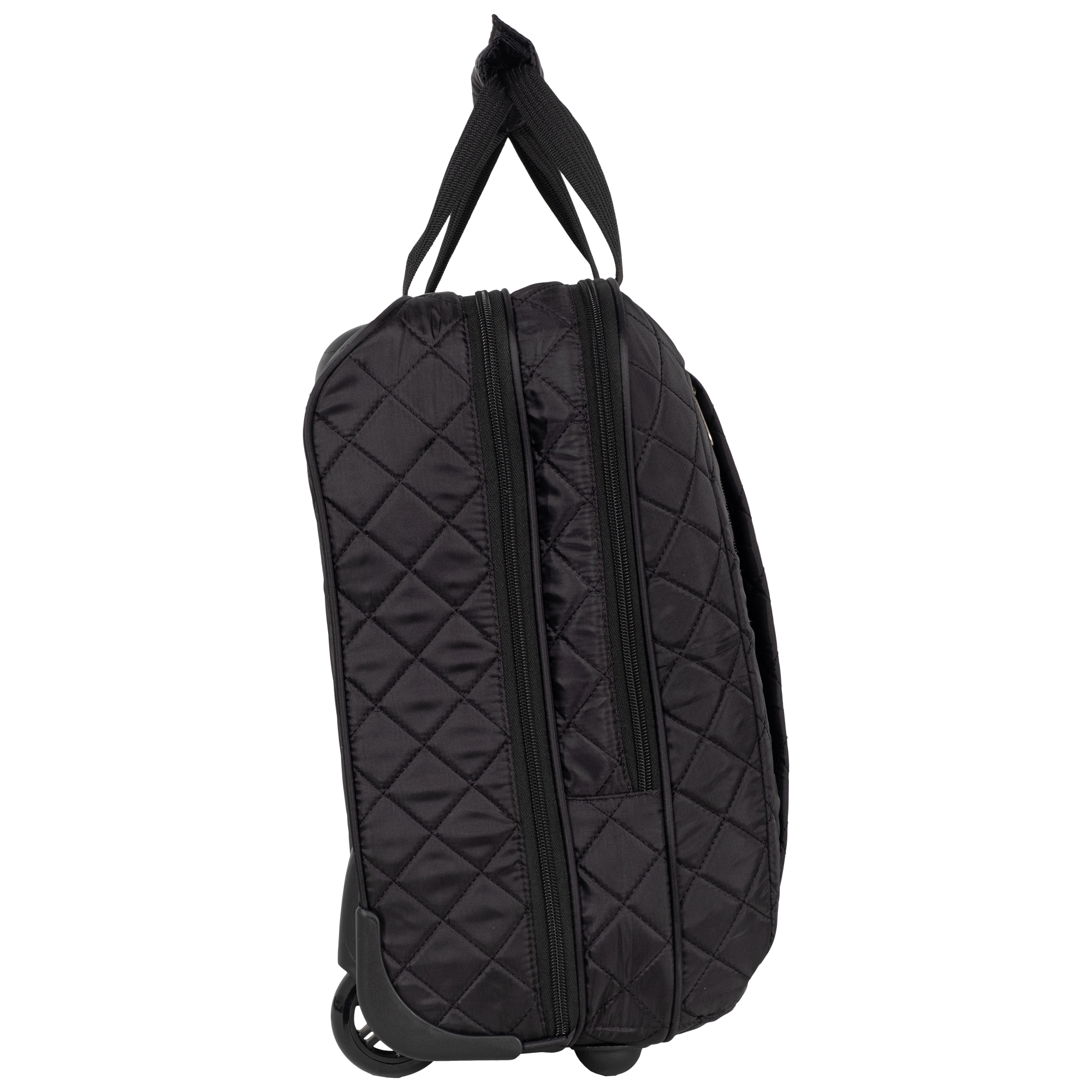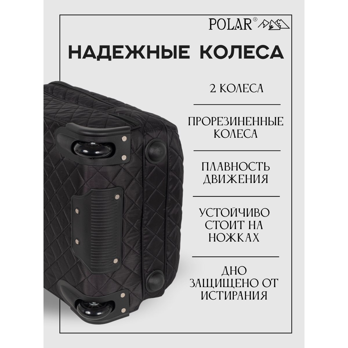 Колеса прорезиненные диаметр 8 см, дно дополнительно защищено от истирания. Сумка устойчиво стоит на ножках. Модель подходит под требования для ручной клади в большинство авиакомпаний.