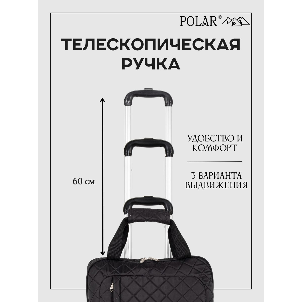 У модели есть две ручки с подручником для переноски, высота которых 16 см. Ручка – тележка выдвигается в три сложения на 60 см.