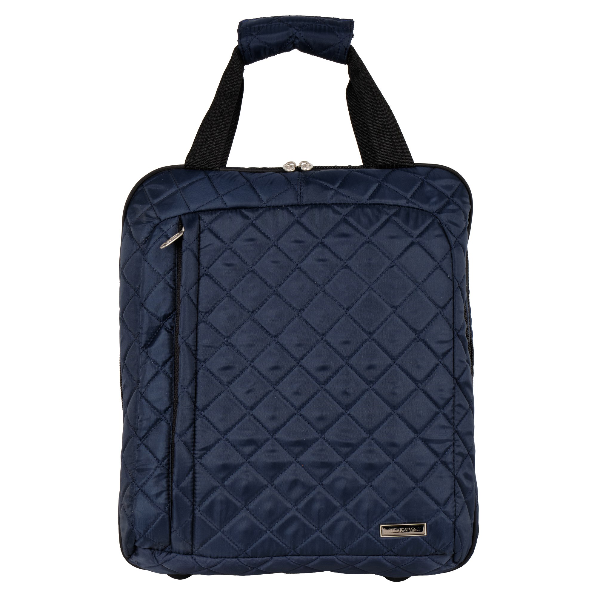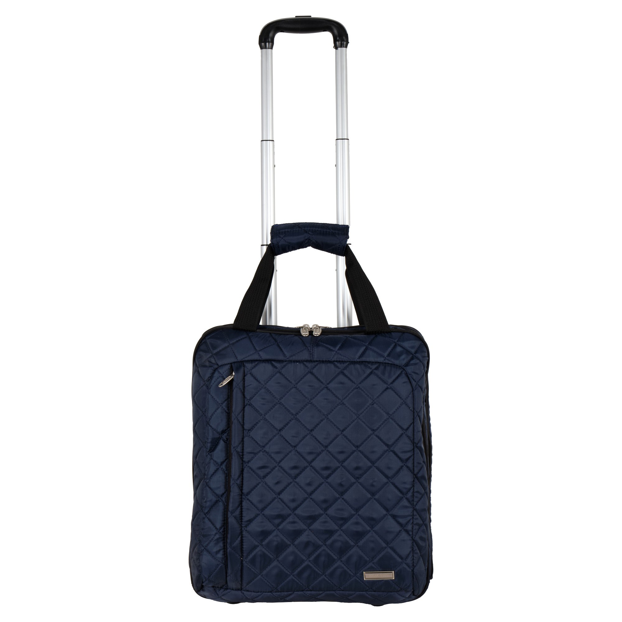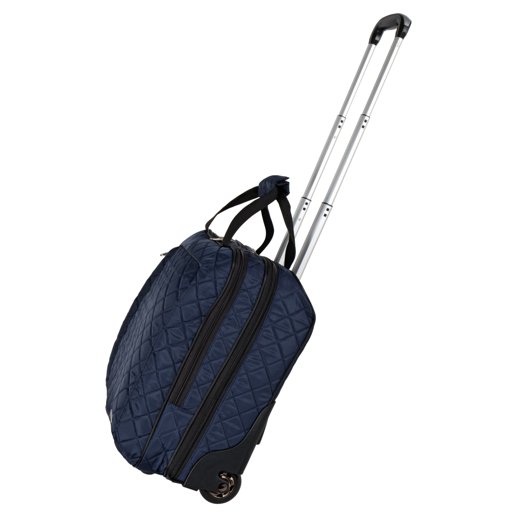 Колеса прорезиненные диаметр 8 см, дно дополнительно защищено от истирания. Сумка устойчиво стоит на ножках. Модель подходит под требования для ручной клади в большинство авиакомпаний.