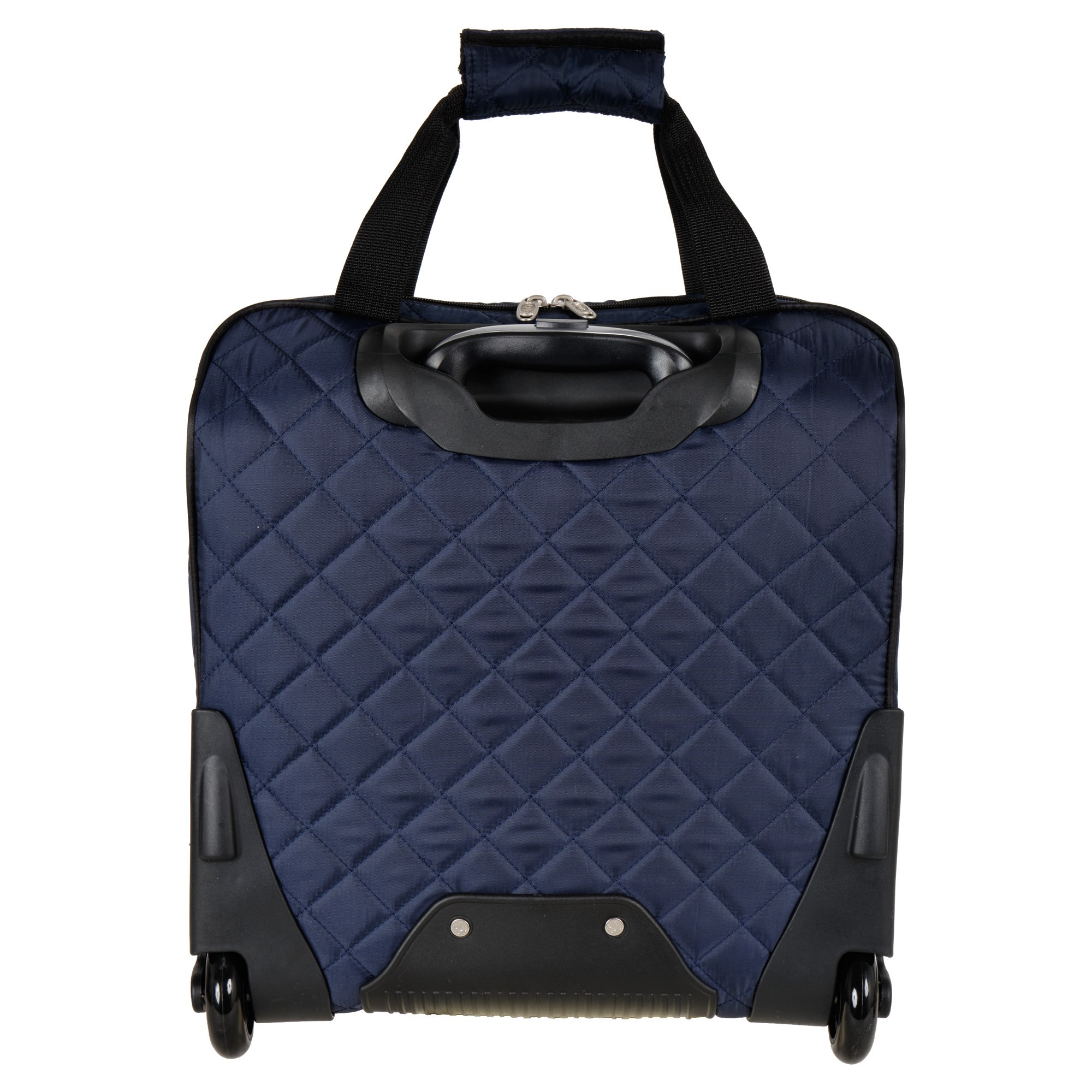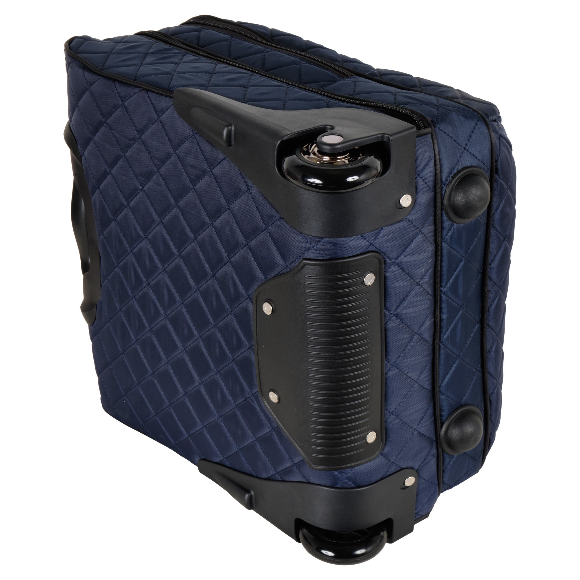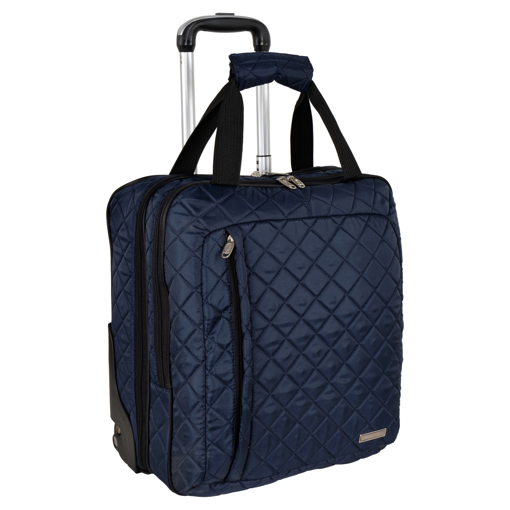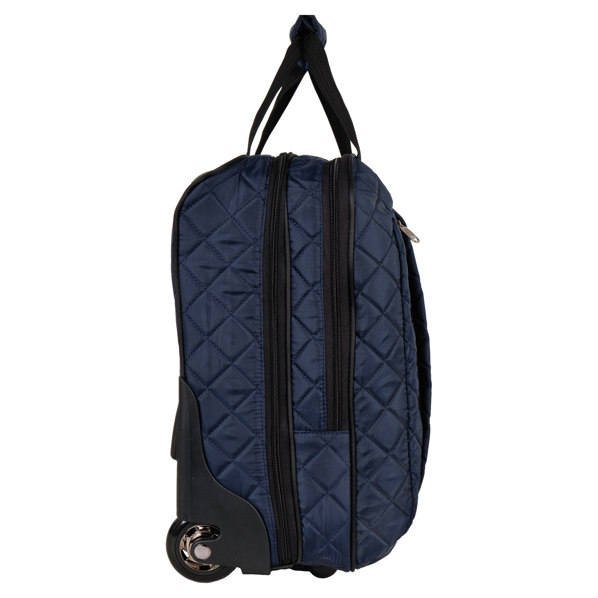 Колеса прорезиненные диаметр 8 см, дно дополнительно защищено от истирания. Сумка устойчиво стоит на ножках. Модель подходит под требования для ручной клади в большинство авиакомпаний.