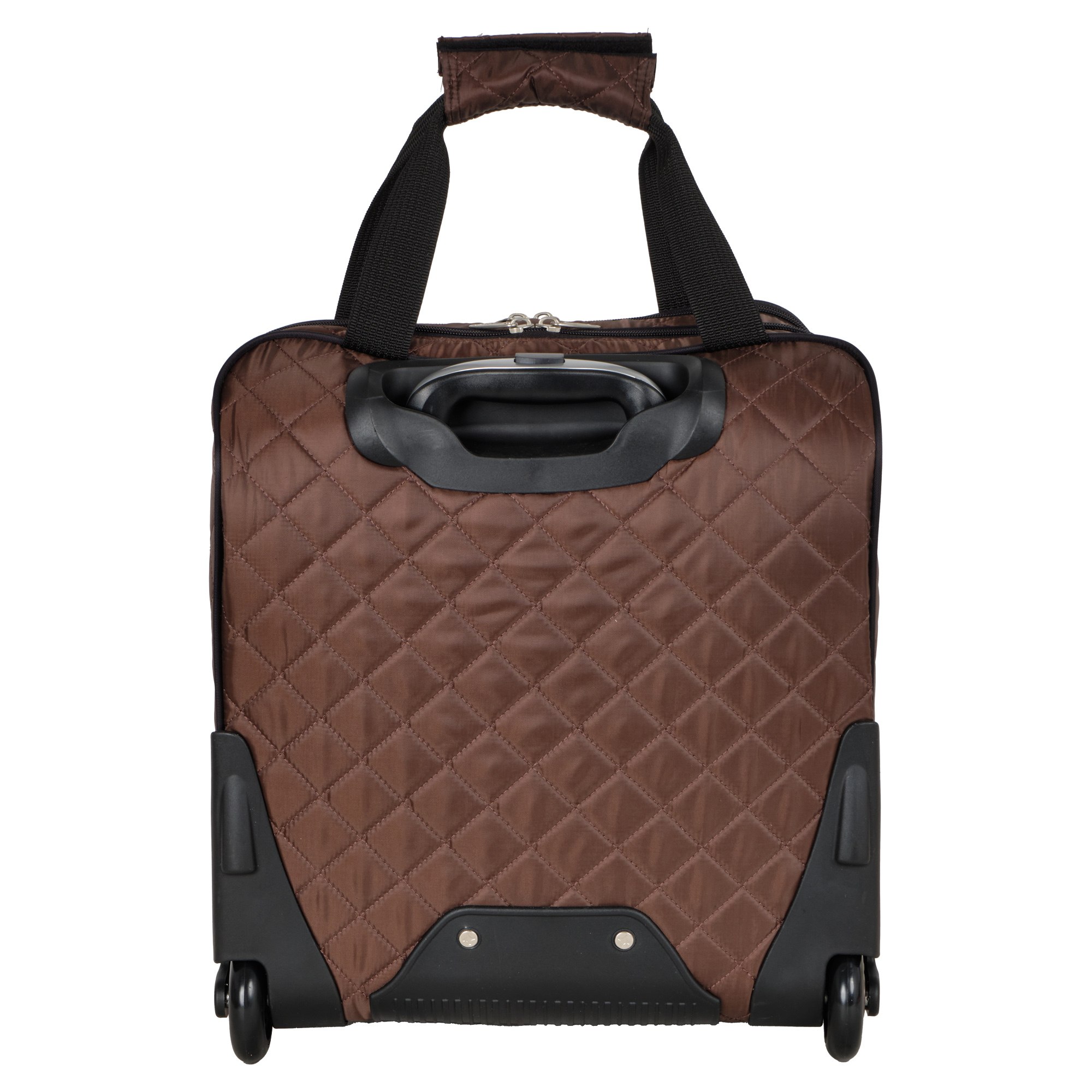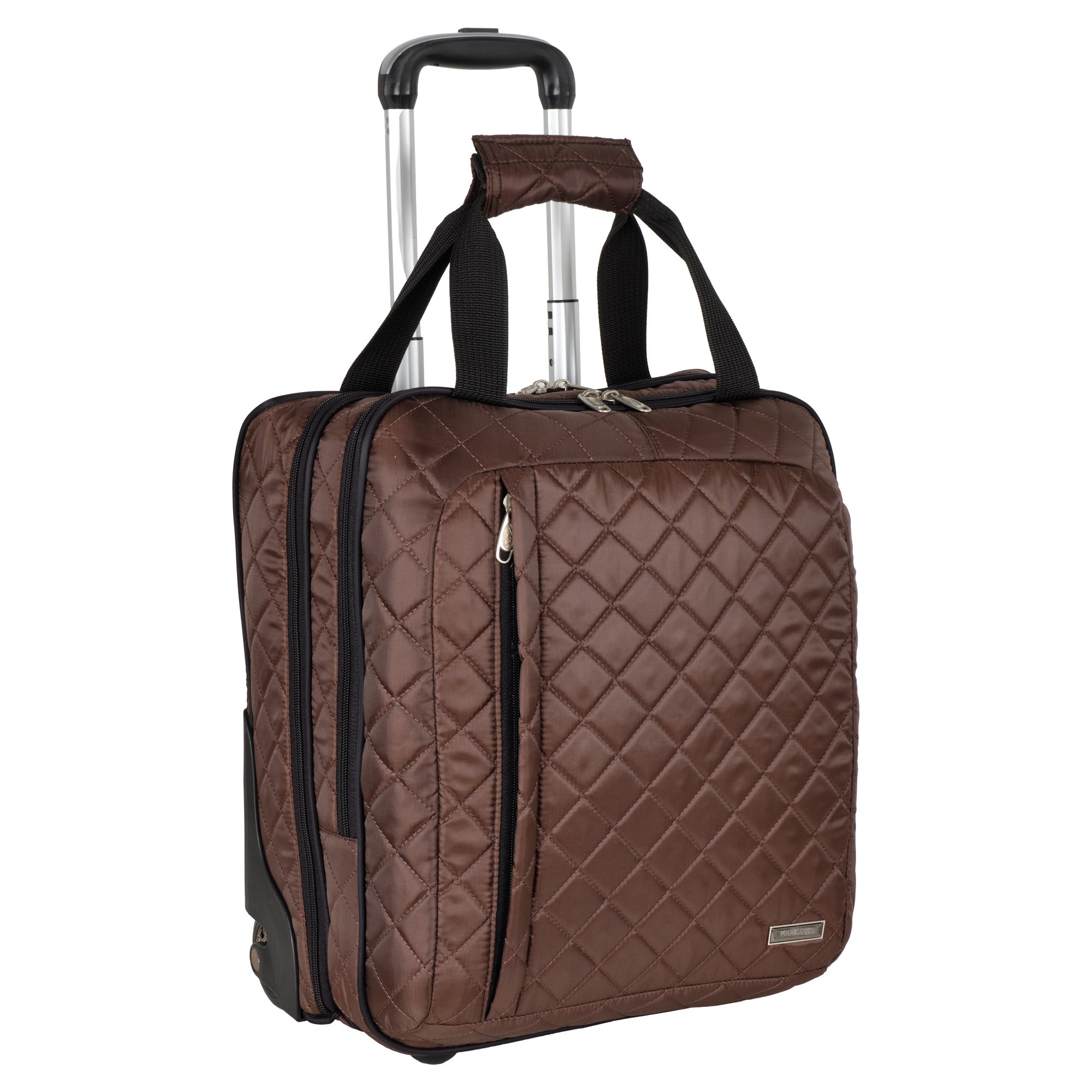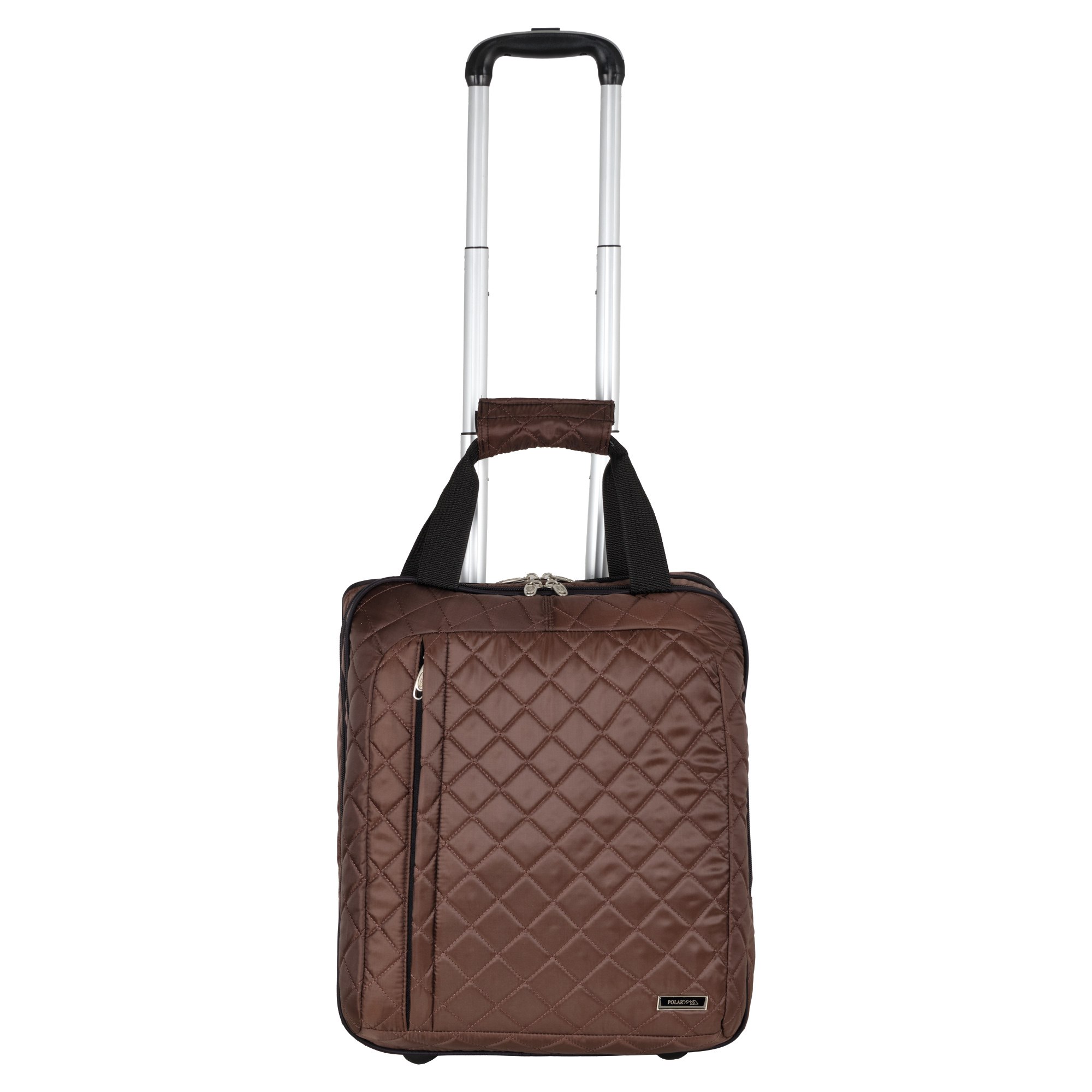 Колеса прорезиненные диаметр 8 см, дно дополнительно защищено от истирания. Сумка устойчиво стоит на ножках. Модель подходит под требования для ручной клади в большинство авиакомпаний.