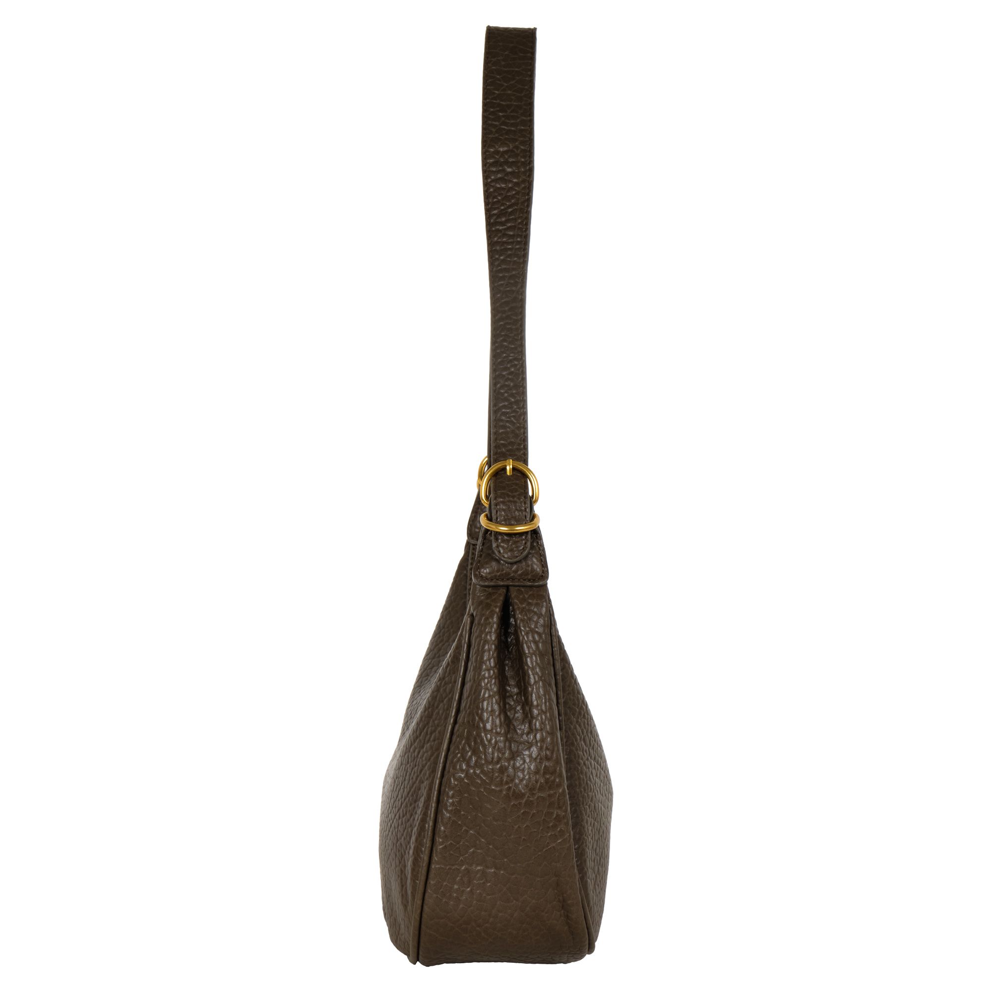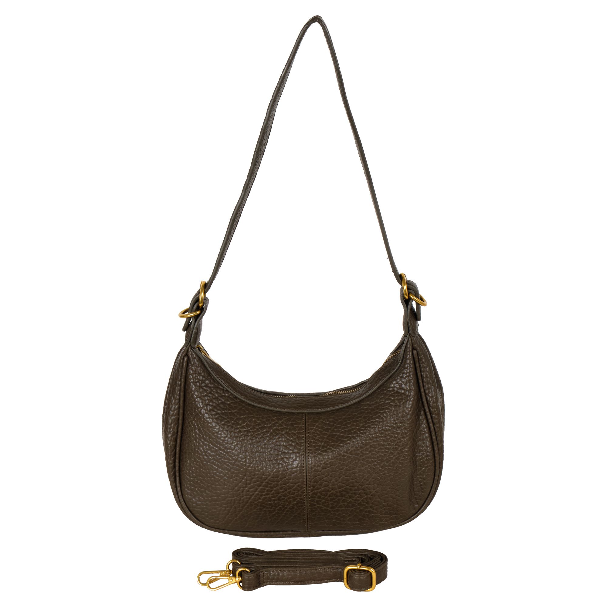 Стильная сумка фирмы POLA выполнена из экокожи. Сумка подойдёт как для выхода в театр, ресторан, так и для прогулки в будние дни в качестве повседневной сумки в виде полумесяца. Основное отделение закрывается на молнию. Внутри есть один карман на молнии и один открытый кармашек.  У данной модели два варианта переноски, съемная ручка, высота 41 см и съемный, регулируемый ремешок из экокожи, высота 125 см. Цвет фурнитуры-золото.