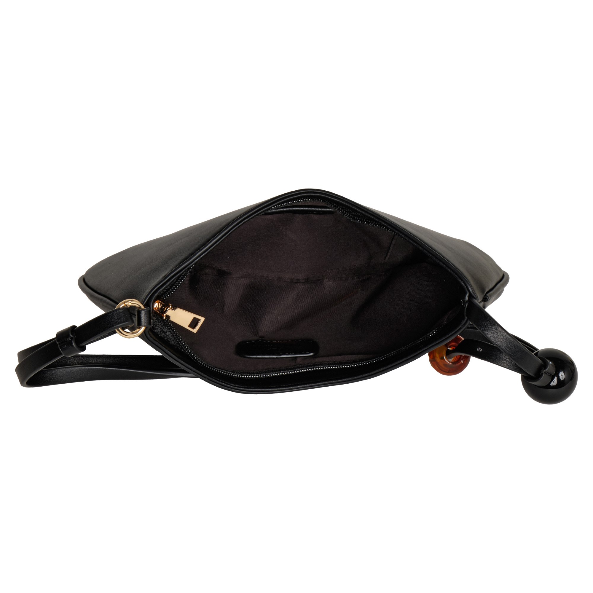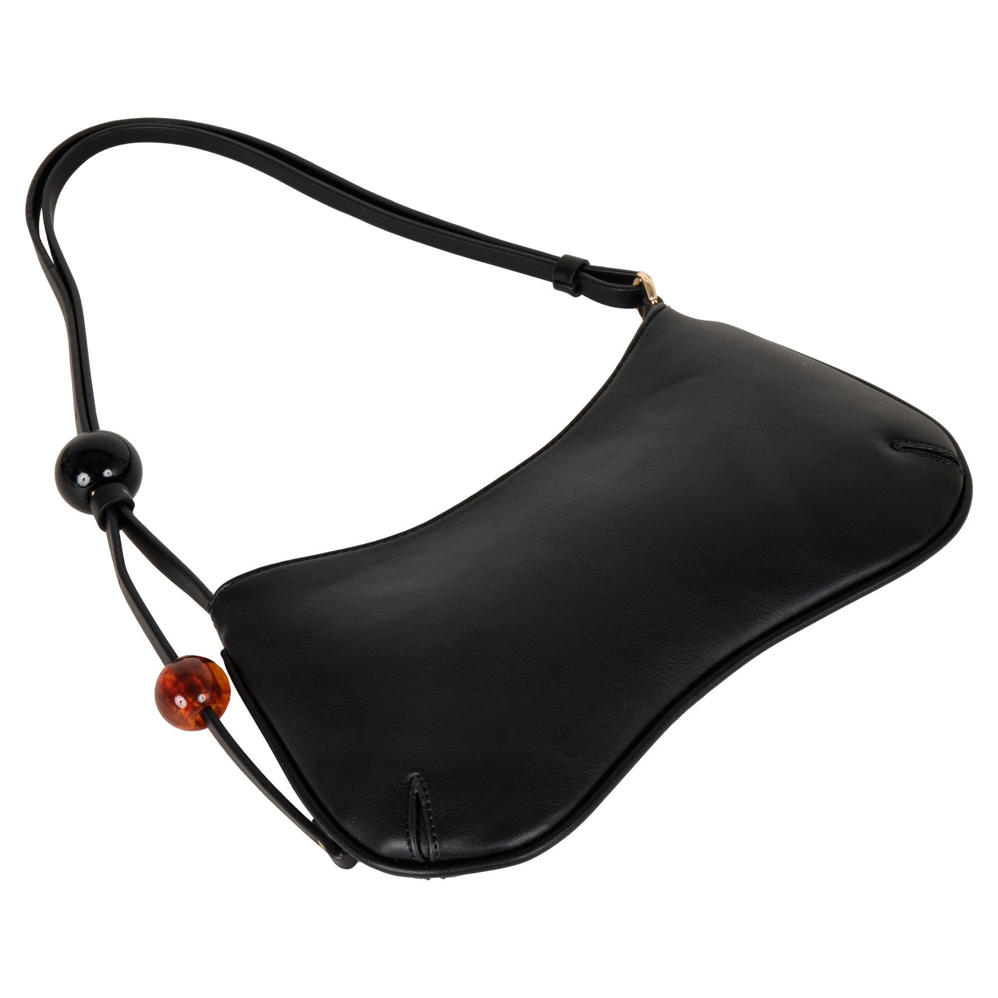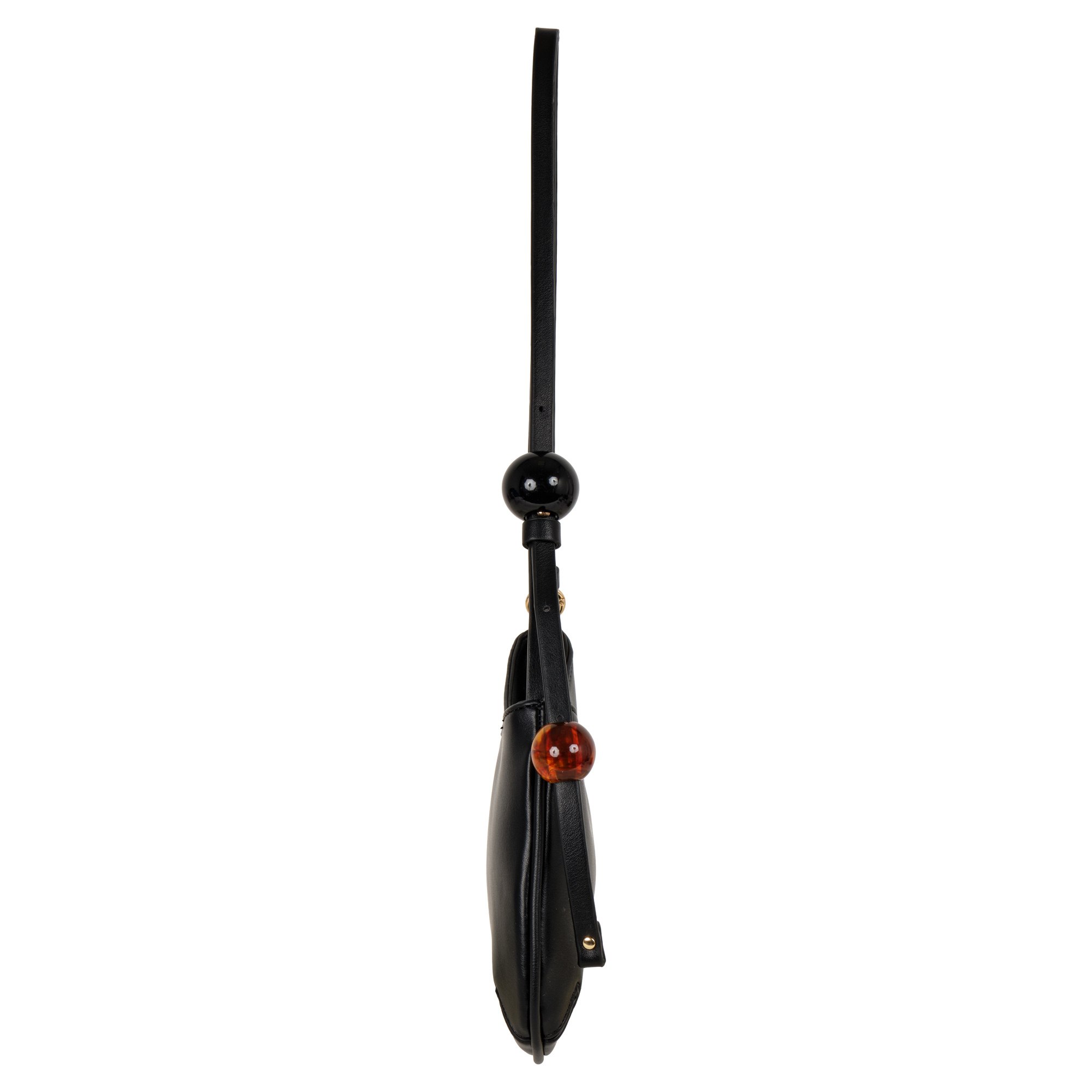 Небольшую сумку фирмы POLA выполнили из гладкой экокожи. Длину узкой двойной ручки, украшенной крупными круглыми бусинами, можно регулировать, поэтому аксессуар удобно носить и в руке, и на плече. Максимальная высота ручки 38 см. В основное отделение, закрывающееся молнией, поместятся смартфон, кошелек и ключи. Внутри один открытый кармашек. Цвет фурнитуры-золото.