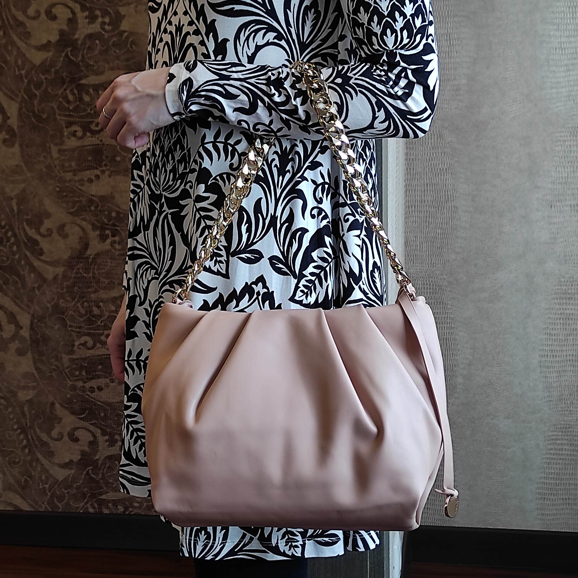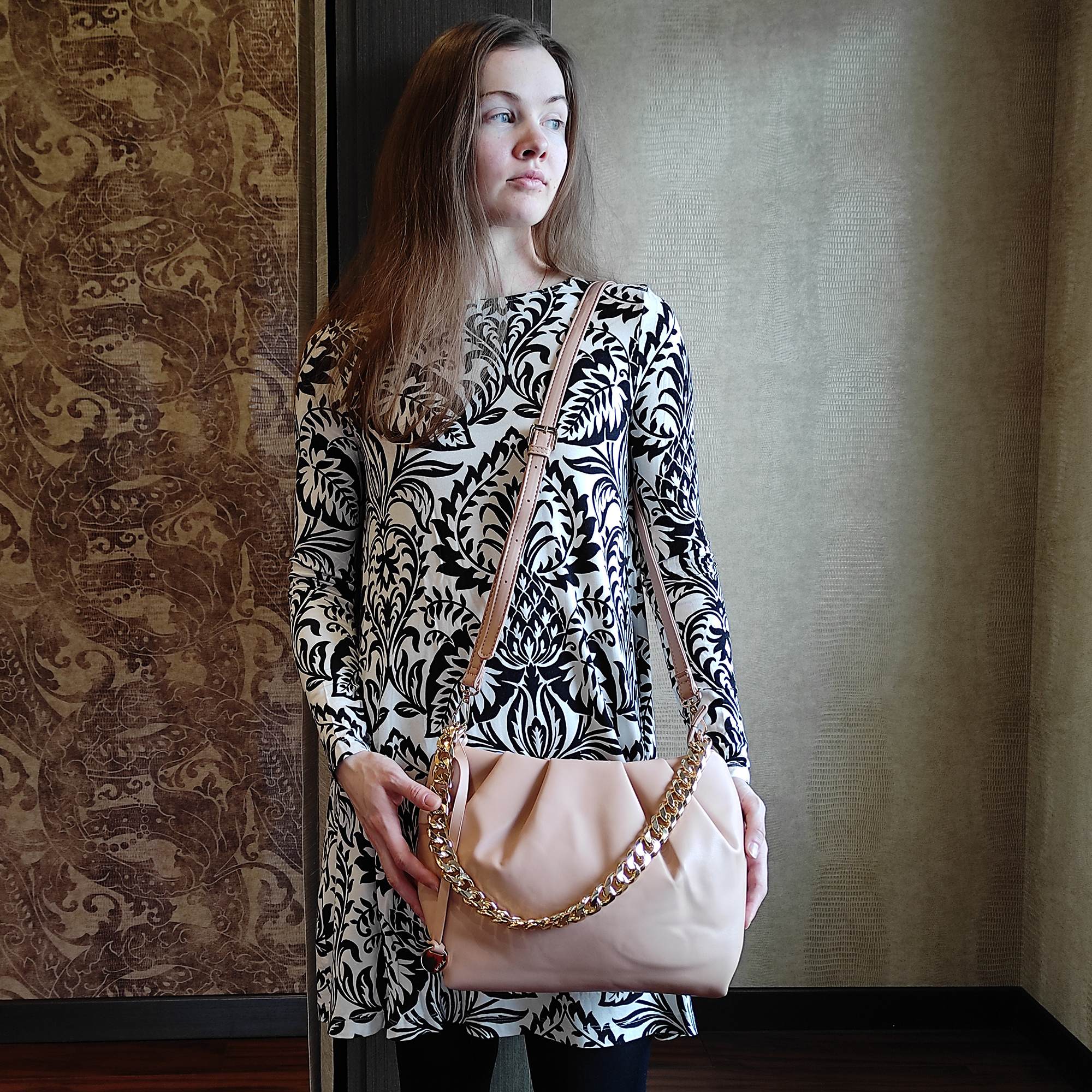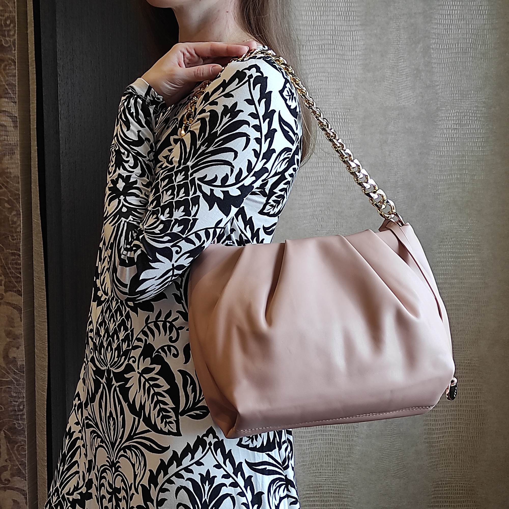 Стильная сумка фирмы Pola выполнена из экокожи и предназначена для повседневного использования. Основное отделение закрывается на молнию. Внутри есть потайной карман на молнии и открытый карман. У данной модели два варианта переноски, металлическая массивная цепь, очень легкая высота 29 см и съемный, регулируемый ремешок из экокожи, длина 121см. Цвет фурнитуры-золото.
