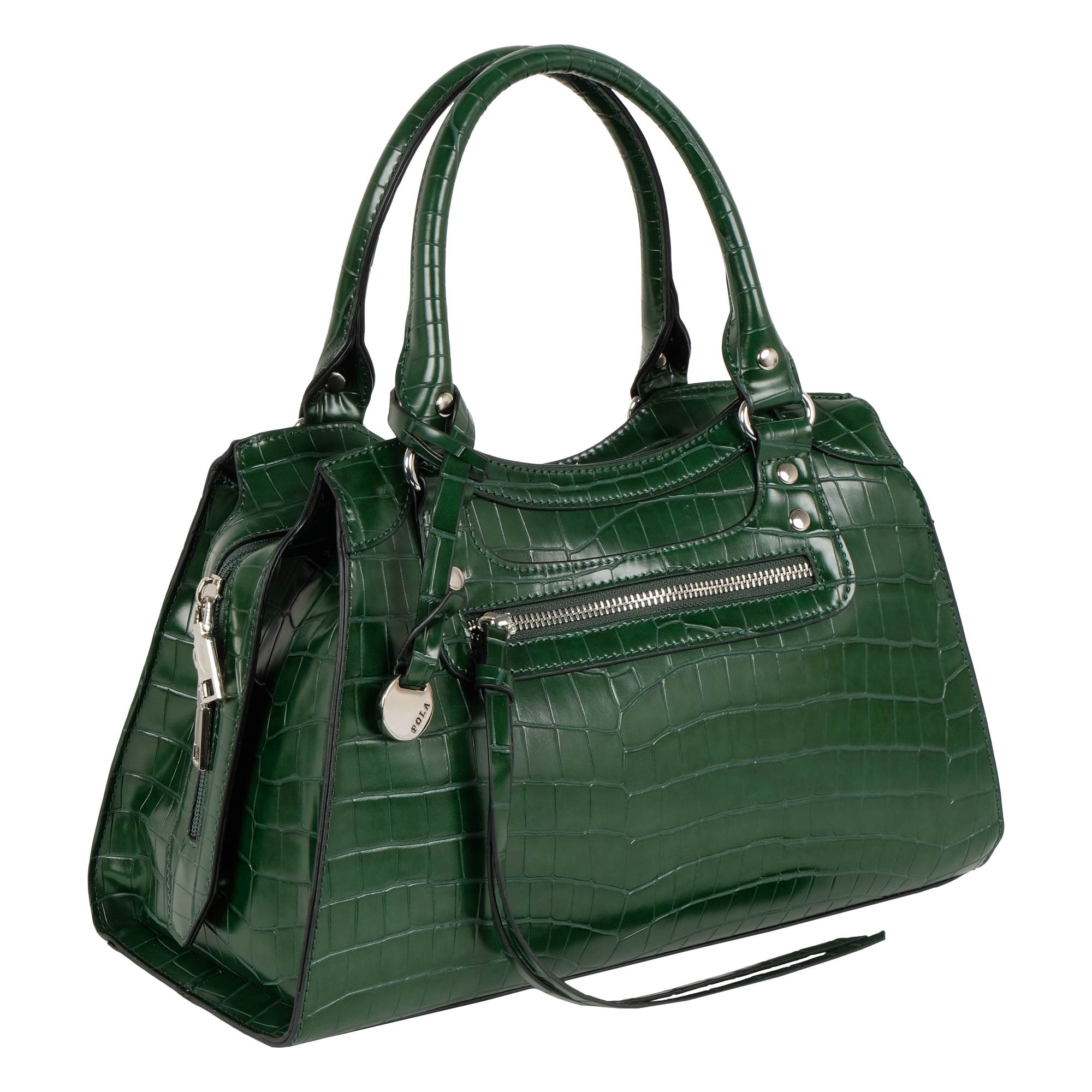 Стильная сумка фирмы Pola выполнена из экокожи с имитацией кожи рептилии и закрывается на металлическую молнию. По бокам молния фиксируется на магнитную кнопку. Внутри основного отделения есть небольшой кармашек на молнии и два открытых кармана для мелочей. Спереди модель украшена коротким ремешком и заклепками, есть накладной карман на молнии для ключей. Сумка прекрасно подойдёт женщинам, предпочитающим деловой, классический стиль. У сумки есть две ручки для переноски, высота которых 16 см и съёмный, регулируемый ремень, длина которого 132 см. Цвет фурнитуры-серебро.