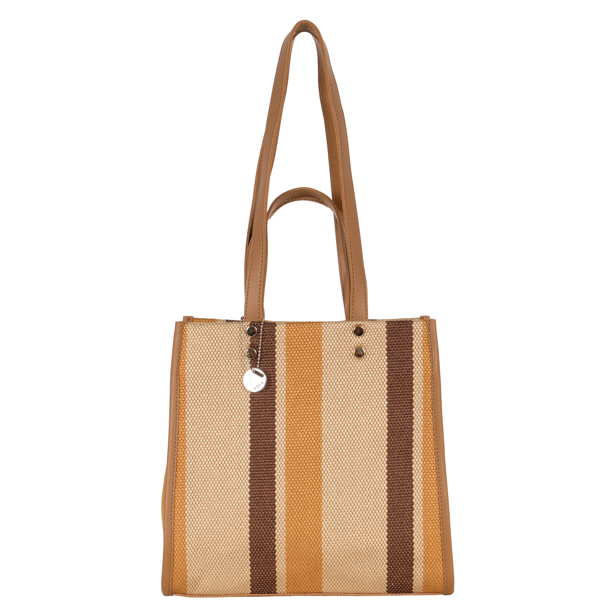 Современная оригинальная сумка фирмы Pola несомненно дополнит ваш образ. Выполнена из текстильного материала с вставками из искусственной кожи, внутри текстильная подкладка. Модель ярких цветов, жёсткой формы с широким дном, имеет четыре ручки для переноски. Высота ручек 18 см и 34 см. Сумка с одним отделением на молнии, внутри дополнительные кармашки один на молнии и один открытый. Цвет фурнитуры-золото.