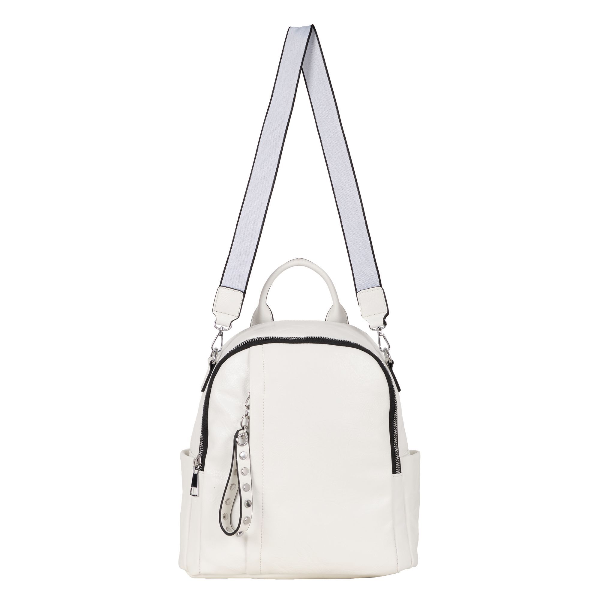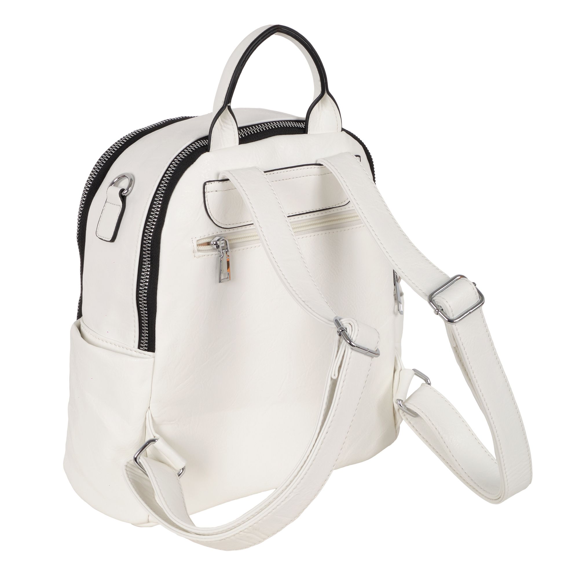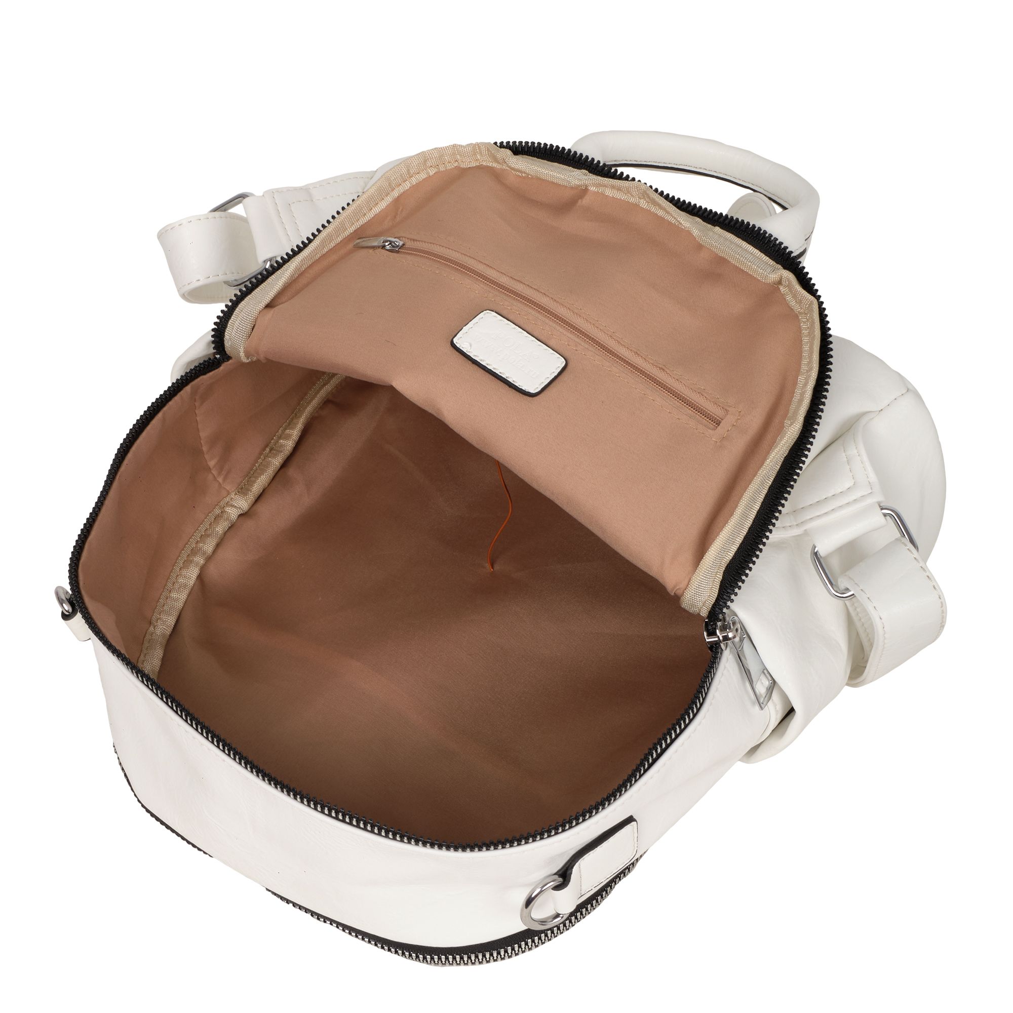 Женская сумка-рюкзак фирмы Pola выполнен из экокожи. Отлично подойдет для повседневного использования. У сумки- рюкзака два независимых отделения застегиваются на металлическую молнию. Центральный отсек для персональных вещей в ней также можно разместить документы формата А4, есть маленький карман на молнии для небольших предметов. Большой передний карман внутри с небольшим открытым карманом для мелочей. Спереди есть вертикальный  карман на молнии. Сзади также есть небольшой потайной кармашек. Два боковых кармана. У сумки-рюкзака есть съёмный ремень максимальная длина 83 см за счет него рюкзак можно носить на плече как сумку. Максимальная длина лямок рюкзака 90см. Длина ручки 9 см. Цвет фурнитуры серебро.