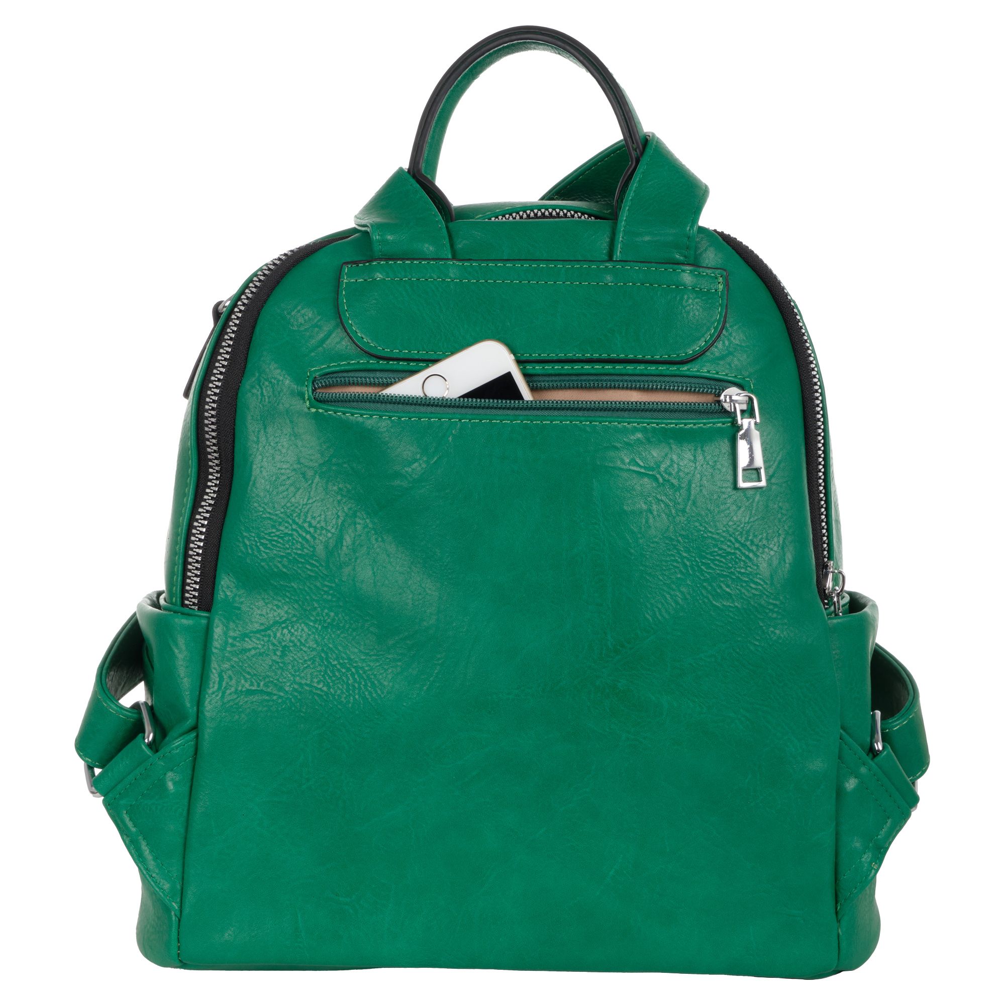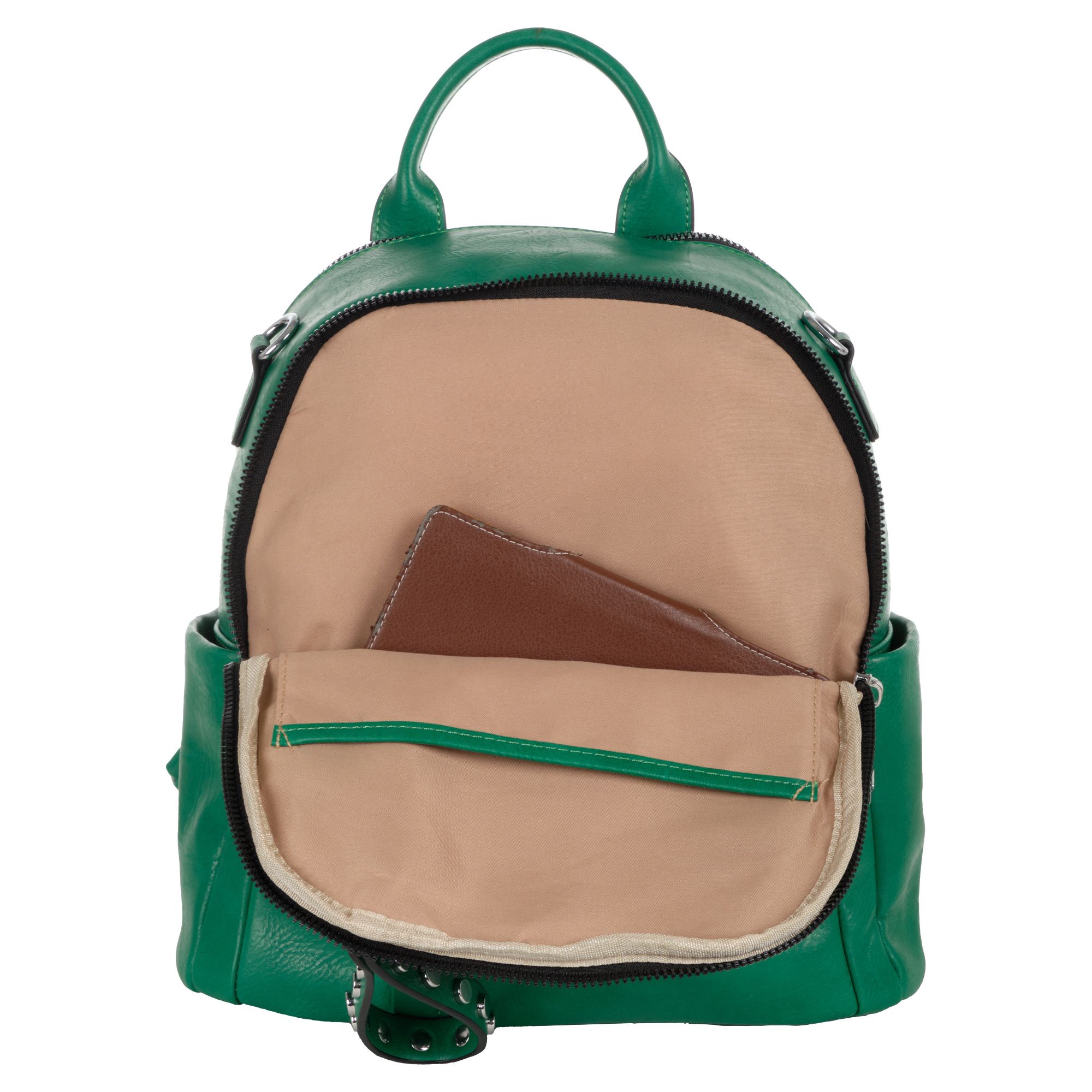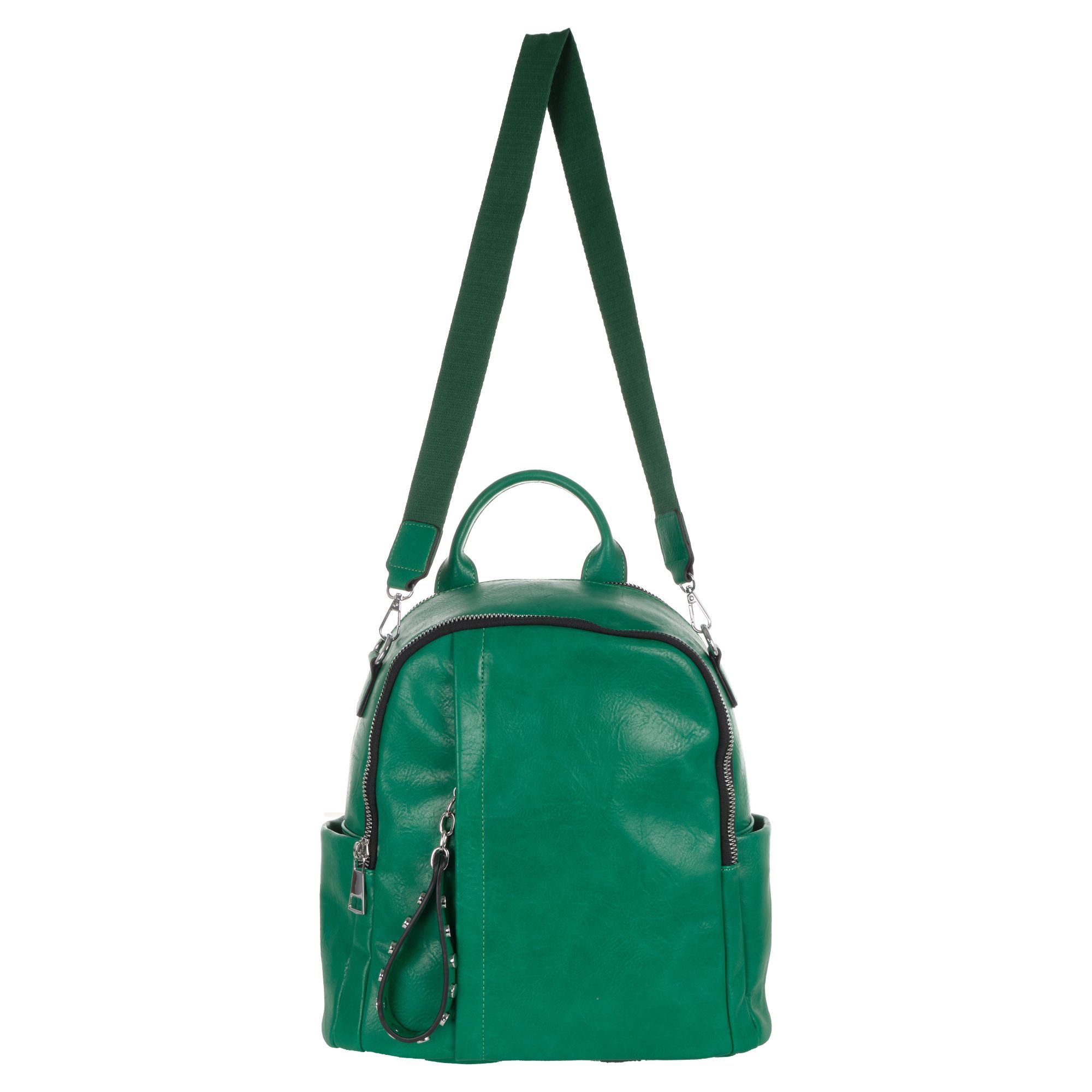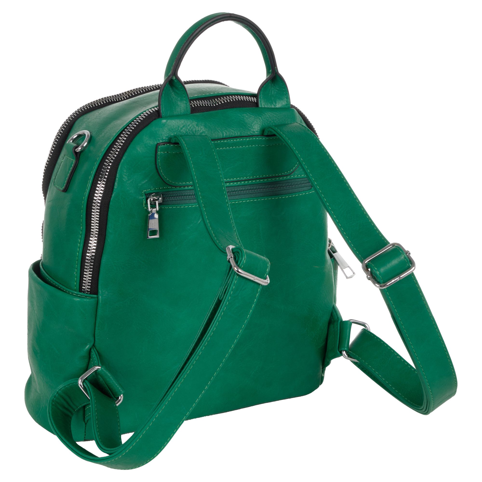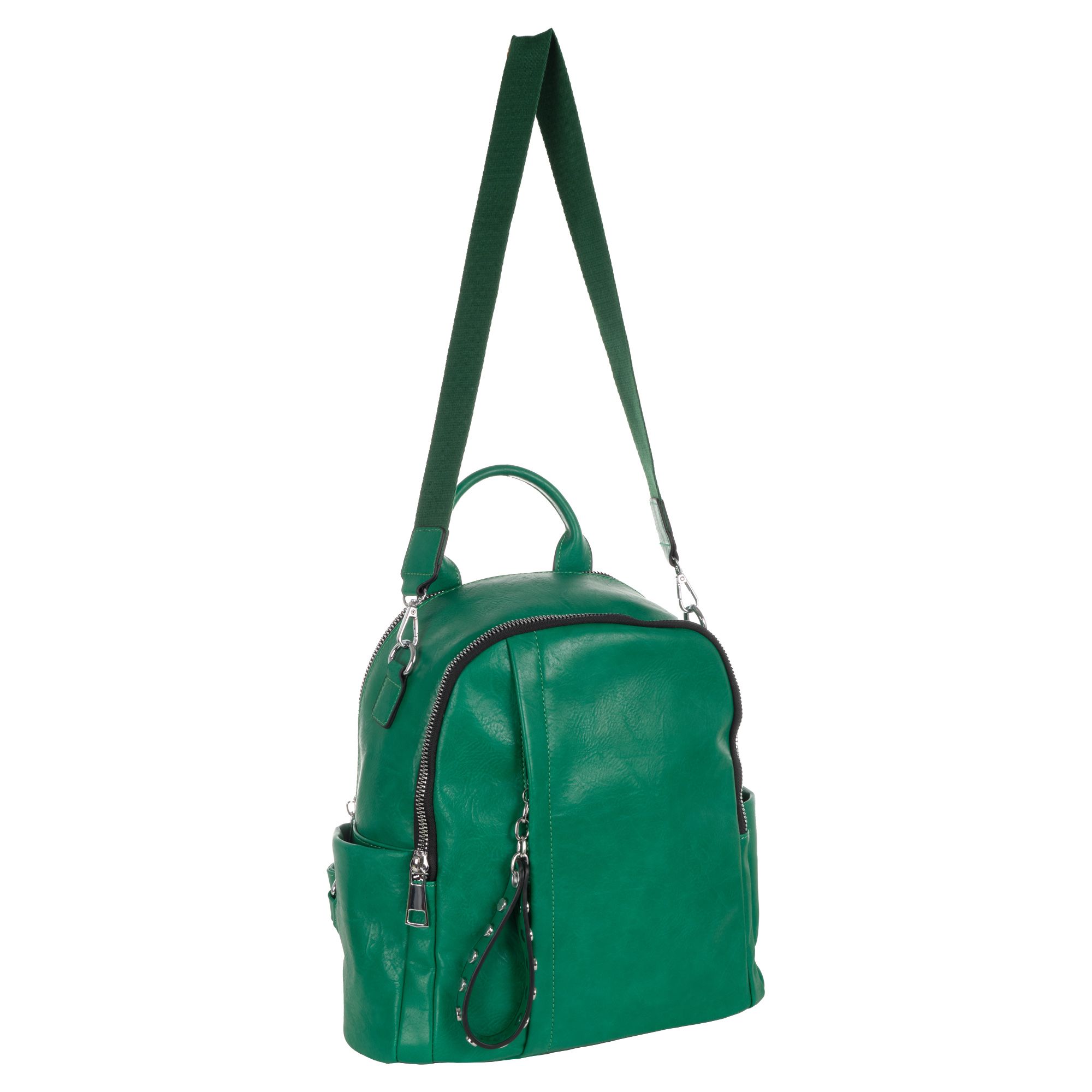 Женская сумка-рюкзак фирмы Pola выполнен из экокожи. Отлично подойдет для повседневного использования. У сумки- рюкзака два независимых отделения застегиваются на металлическую молнию. Центральный отсек для персональных вещей в ней также можно разместить документы формата А4, есть маленький карман на молнии для небольших предметов. Большой передний карман внутри с небольшим открытым карманом для мелочей. Спереди есть вертикальный  карман на молнии. Сзади также есть небольшой потайной кармашек. Два боковых кармана. У сумки-рюкзака есть съёмный ремень максимальная длина 83 см за счет него рюкзак можно носить на плече как сумку. Максимальная длина лямок рюкзака 90см. Длина ручки 9 см. Цвет фурнитуры серебро.