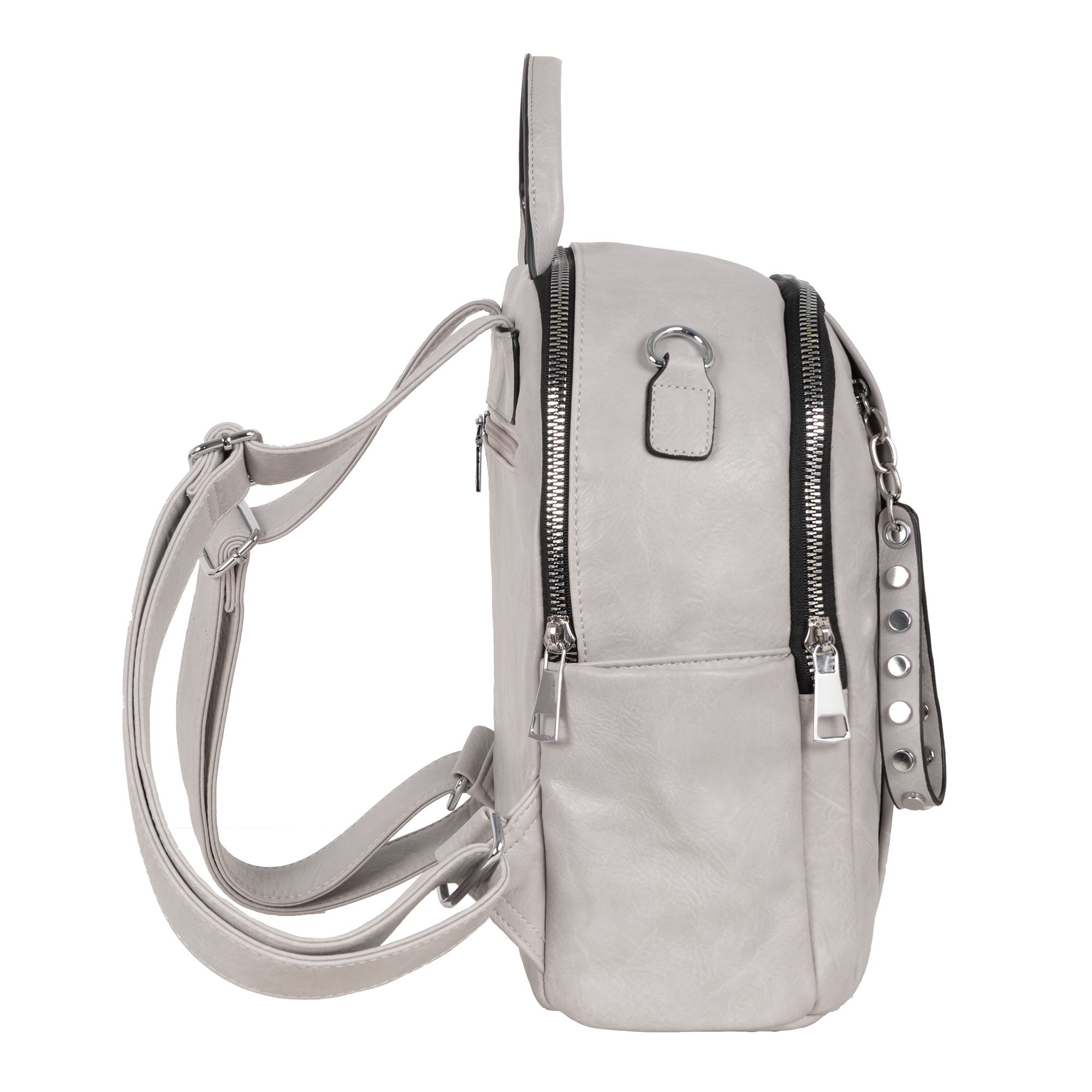 Женская сумка-рюкзак фирмы Pola выполнен из экокожи. Отлично подойдет для повседневного использования. У сумки- рюкзака два независимых отделения застегиваются на металлическую молнию. Центральный отсек для персональных вещей в ней также можно разместить документы формата А4, есть маленький карман на молнии для небольших предметов. Большой передний карман внутри с небольшим открытым карманом для мелочей. Спереди есть вертикальный  карман на молнии. Сзади также есть небольшой потайной кармашек. Два боковых кармана. У сумки-рюкзака есть съёмный ремень максимальная длина 83 см за счет него рюкзак можно носить на плече как сумку. Максимальная длина лямок рюкзака 90см. Длина ручки 9 см. Цвет фурнитуры серебро.