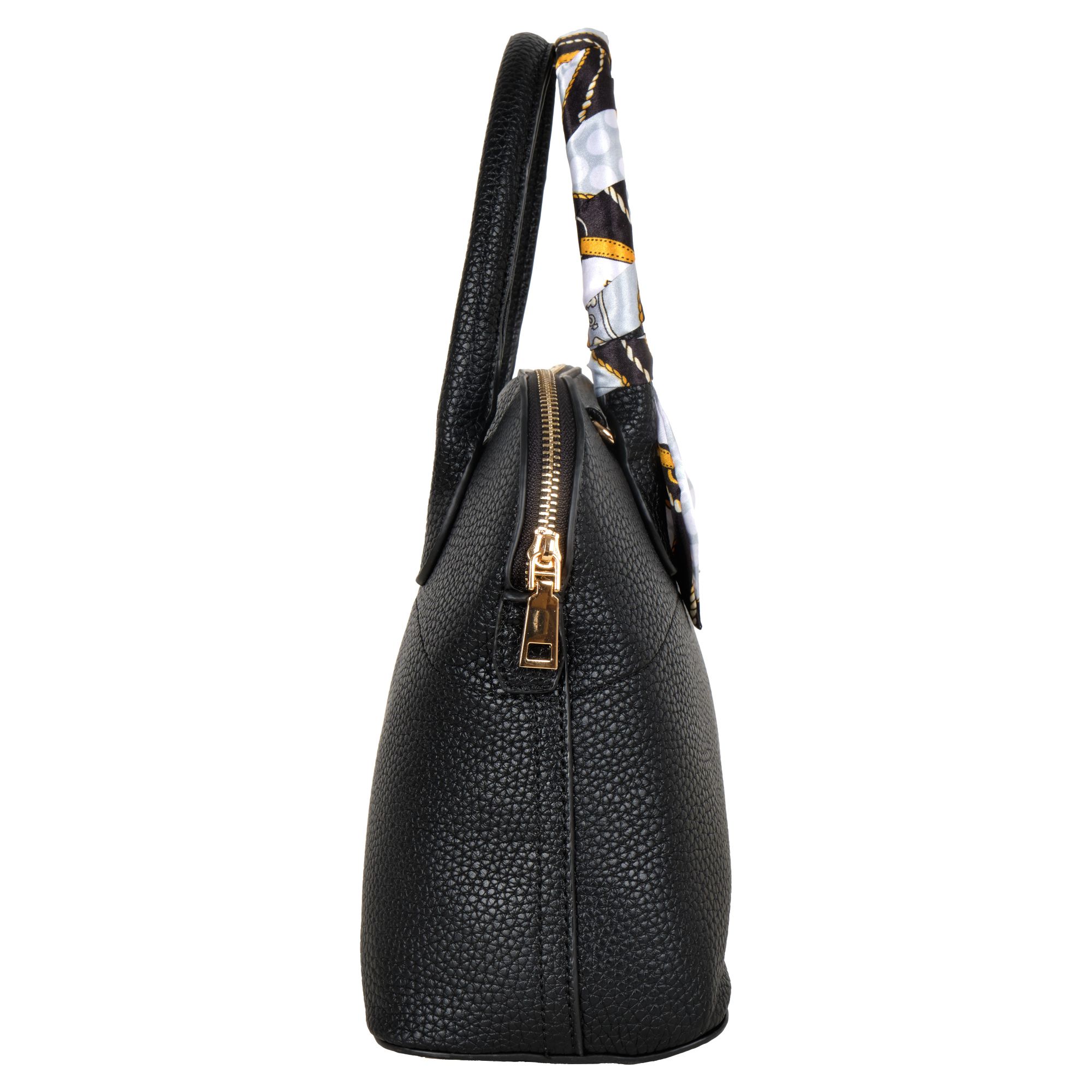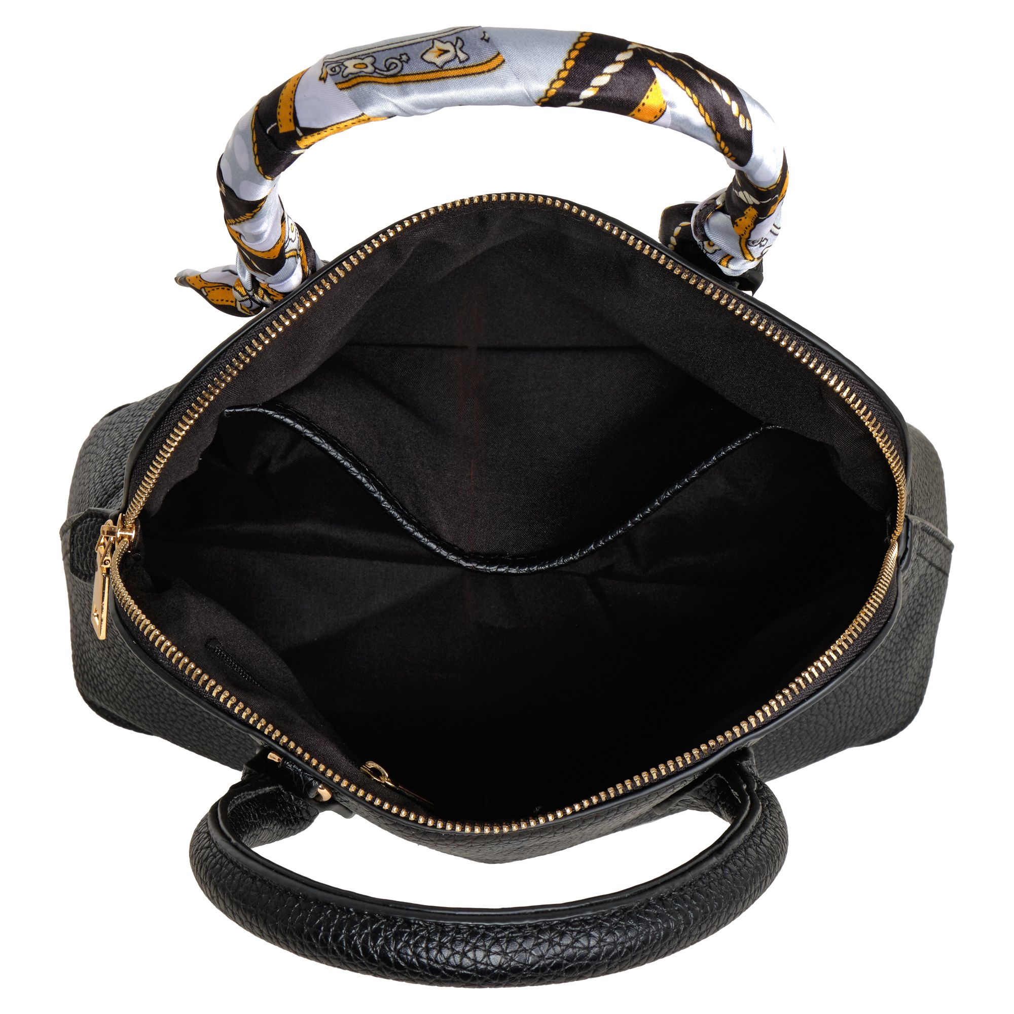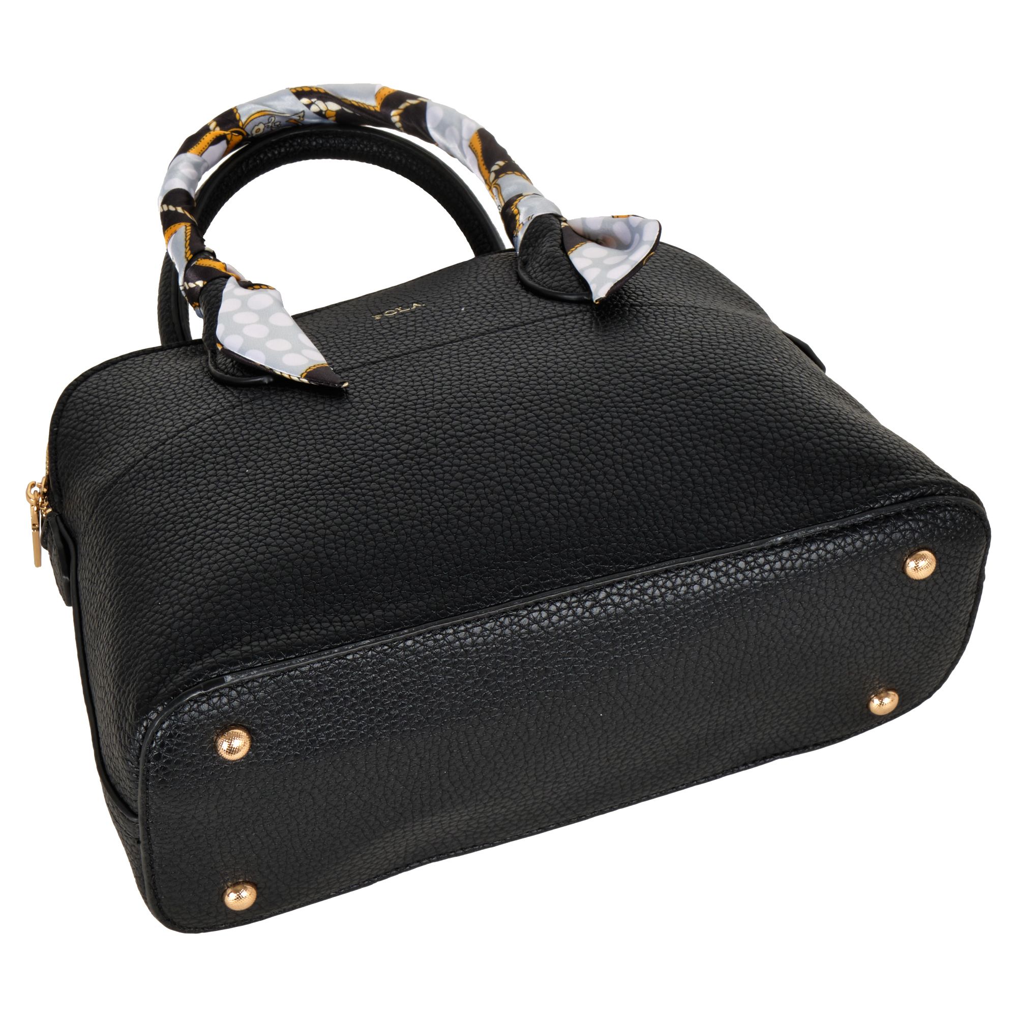 Стильная женская сумка фирмы Pola выполнена из экокожи и украшена платком. Основное отделение закрывается на металлическую молнию. Внутри сумочки есть маленький карман на молнии и два открытых. Сумка прекрасно подойдёт для повседневной носки. У сумки есть ручки для переноски, высота которых составляет 13 см их можно украсить платком и тонкий регулируемый ремешок длина которого- 130 см. Цвет фурнитуры-золото.