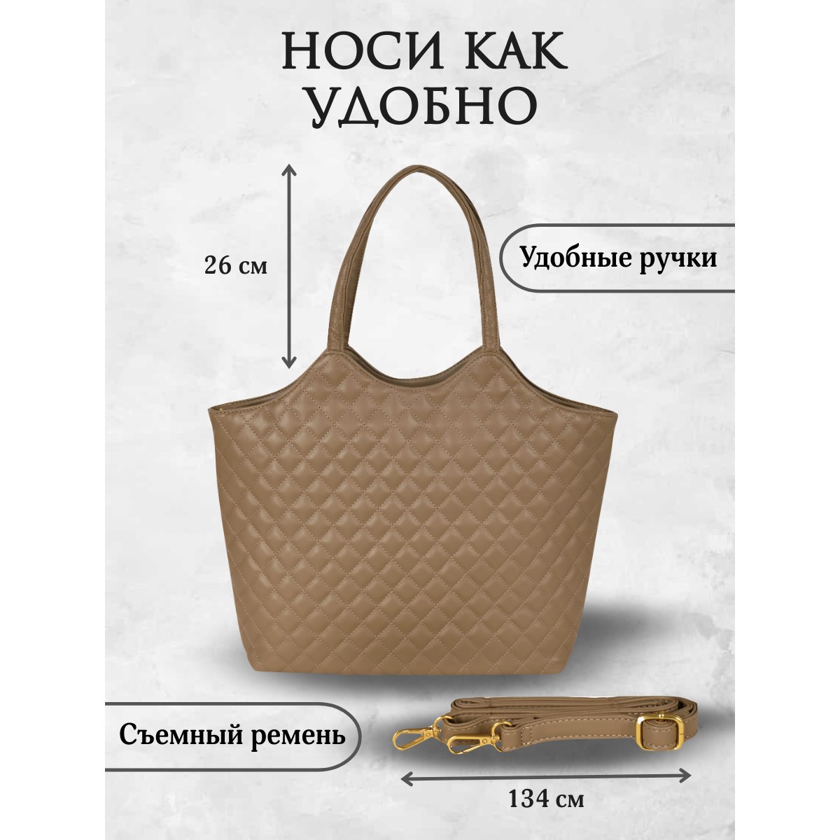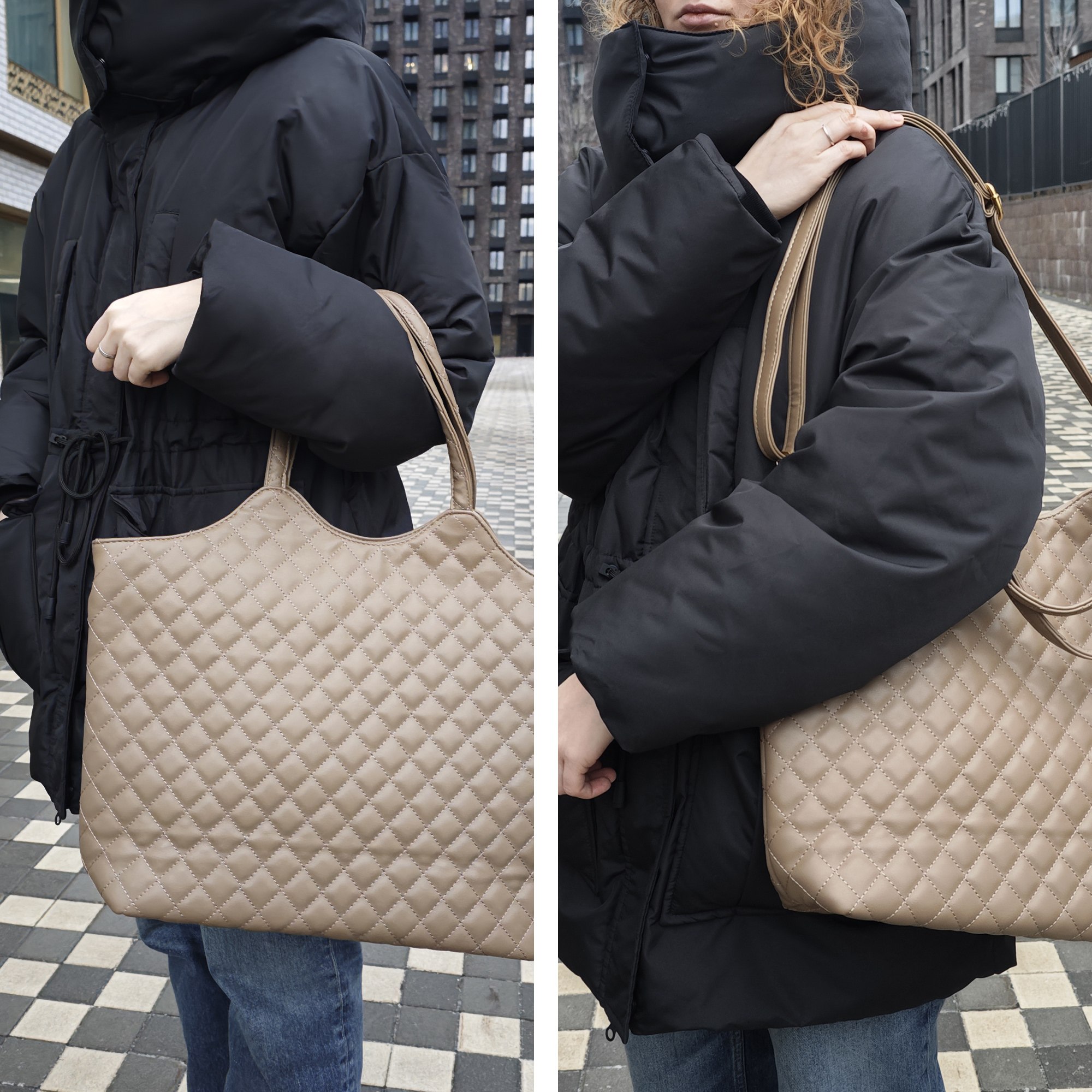 Вместительная стеганая женская сумка Pola выполнена из экокожи. Данная модель продолжает удерживать лидирующие позиции среди трендов!  Данную модель можно классифицировать как-сумка тоут, сумка шоппер, сумка хобо. Основное отделение закрывается на молнию. Внутри два кармана на молнии и открытый кармашек. Вмещает формат А4. Сумку можно переносить с помощью двух ручек, высота которых составляет 26 см, а также на плече с помощью съёмного регулируемого ремня, длина которого составляет 134 см. Цвет фурнитуры-золото.