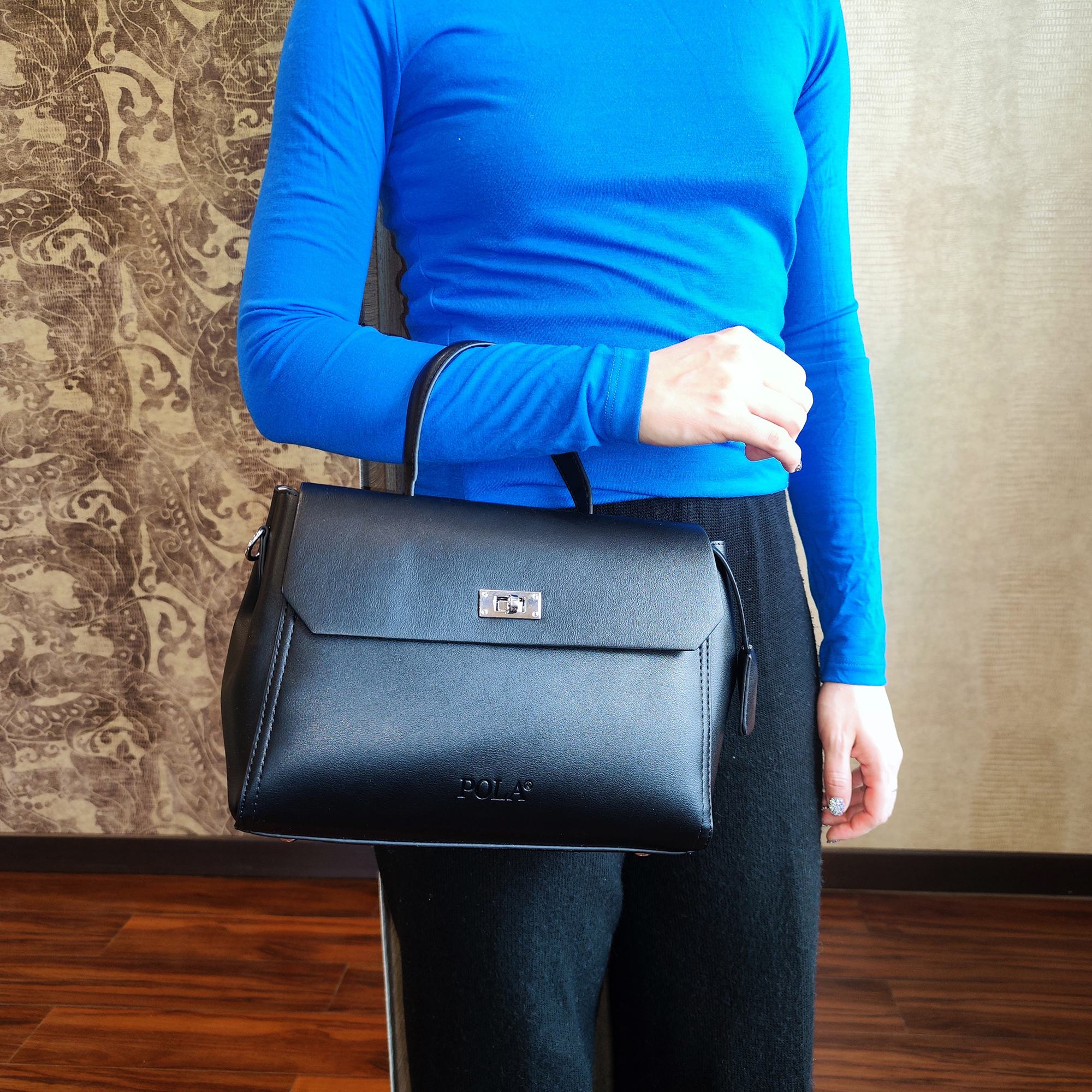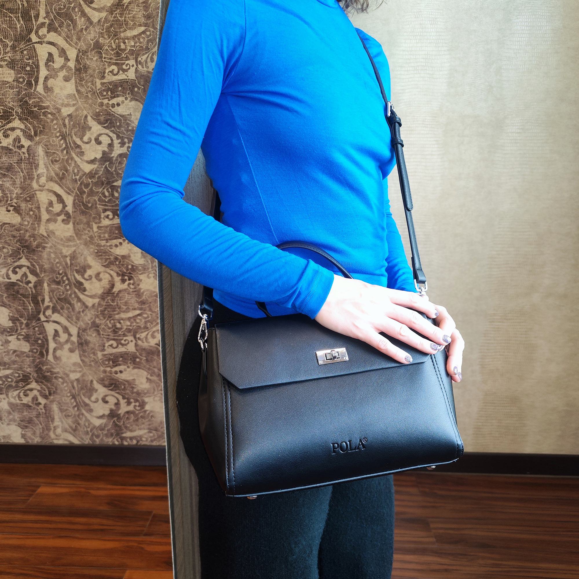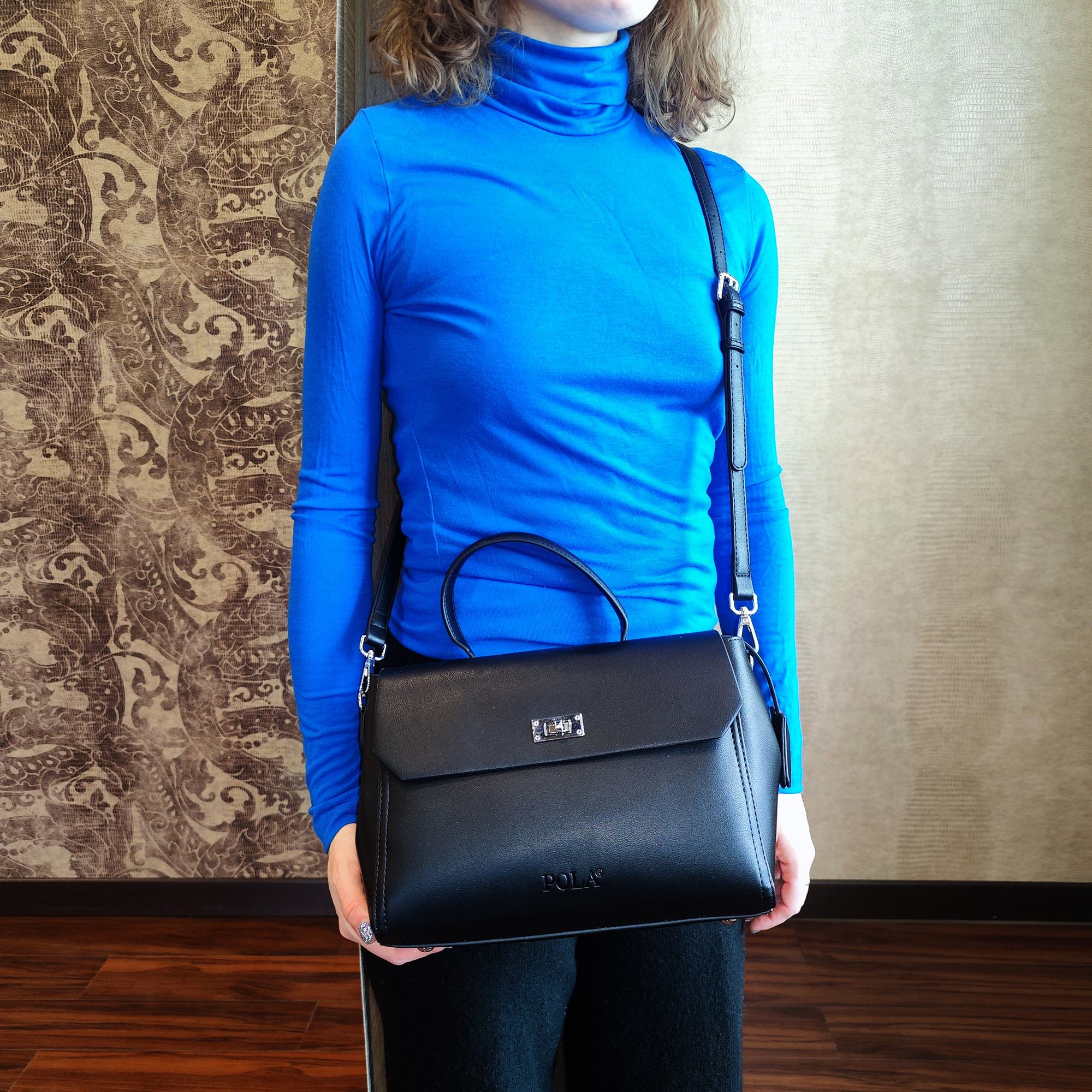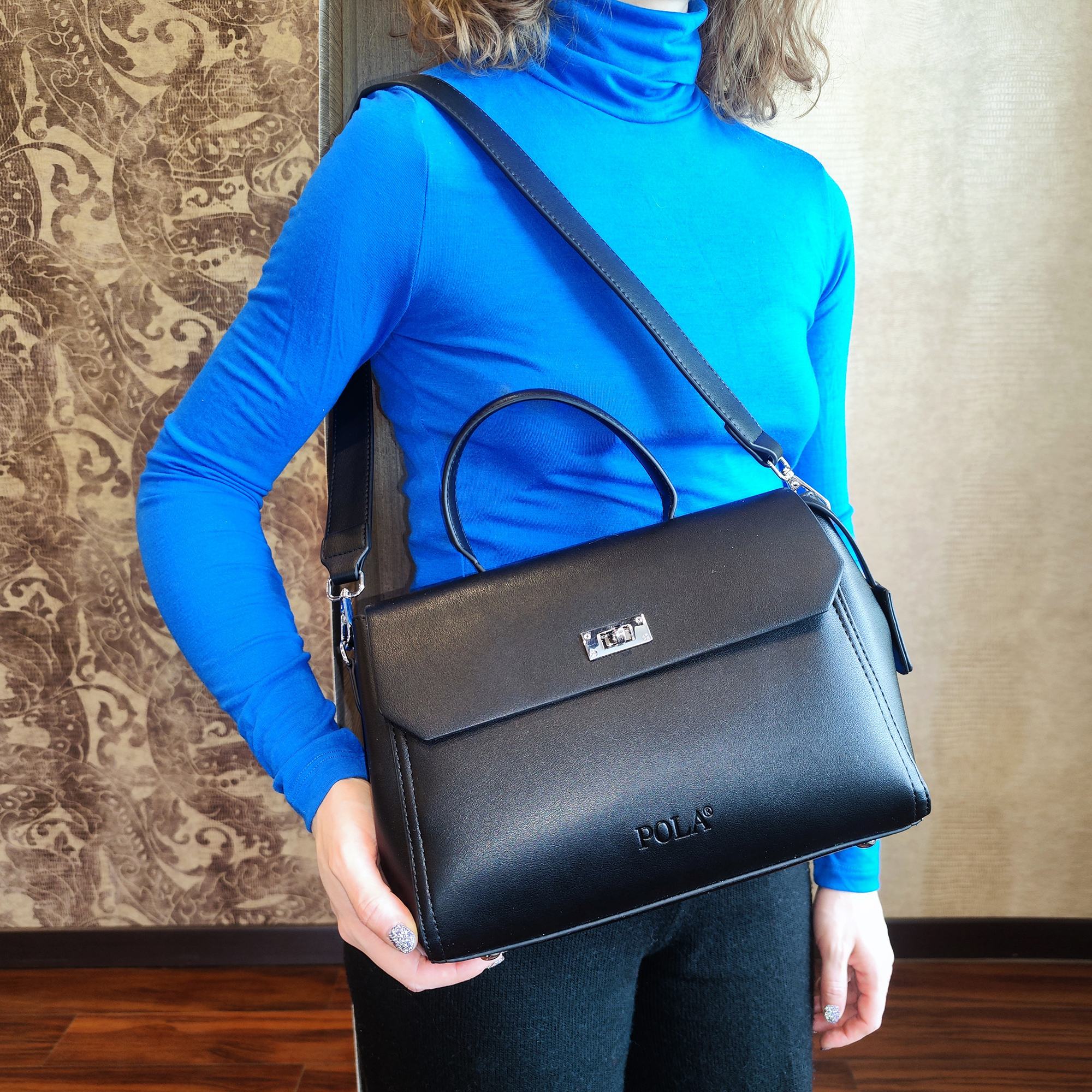 Элегантная сумка Pola выполнена из экокожи. Сумка прекрасно подойдёт женщинам, которые предпочитают деловой стиль. Сумка состоит из одного основного отделения, которое закрывается клапаном на поворотный металлический замок. Внутри основного отделения есть кармашек на молнии и один открытый карман. Сзади сумки присутствует маленький карман на молнии.  У сумки есть ручка для переноски, высота которой 9 см и два съемных ремешка, один тонкий 117 см и 77см второй ремешок шириной 3,5 см. Цвет фурнитуры-серебро.