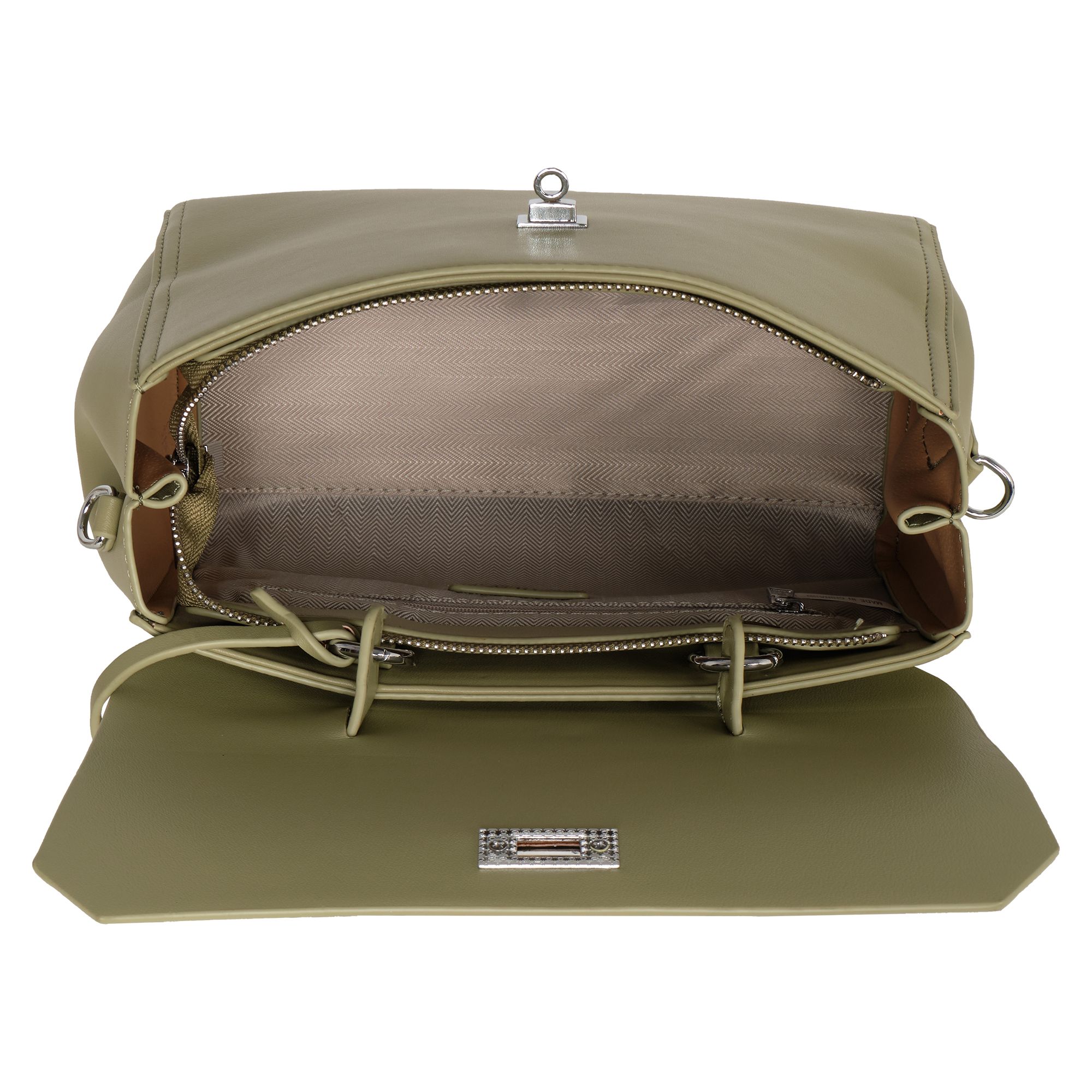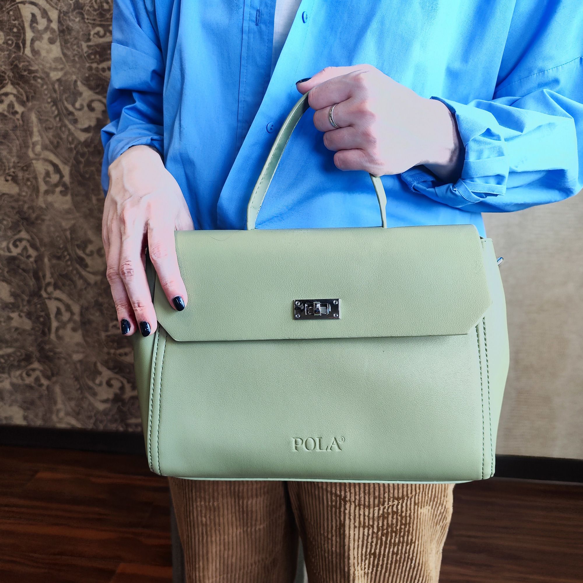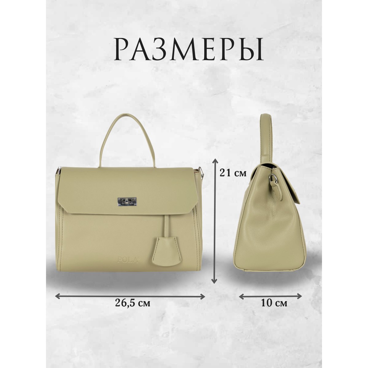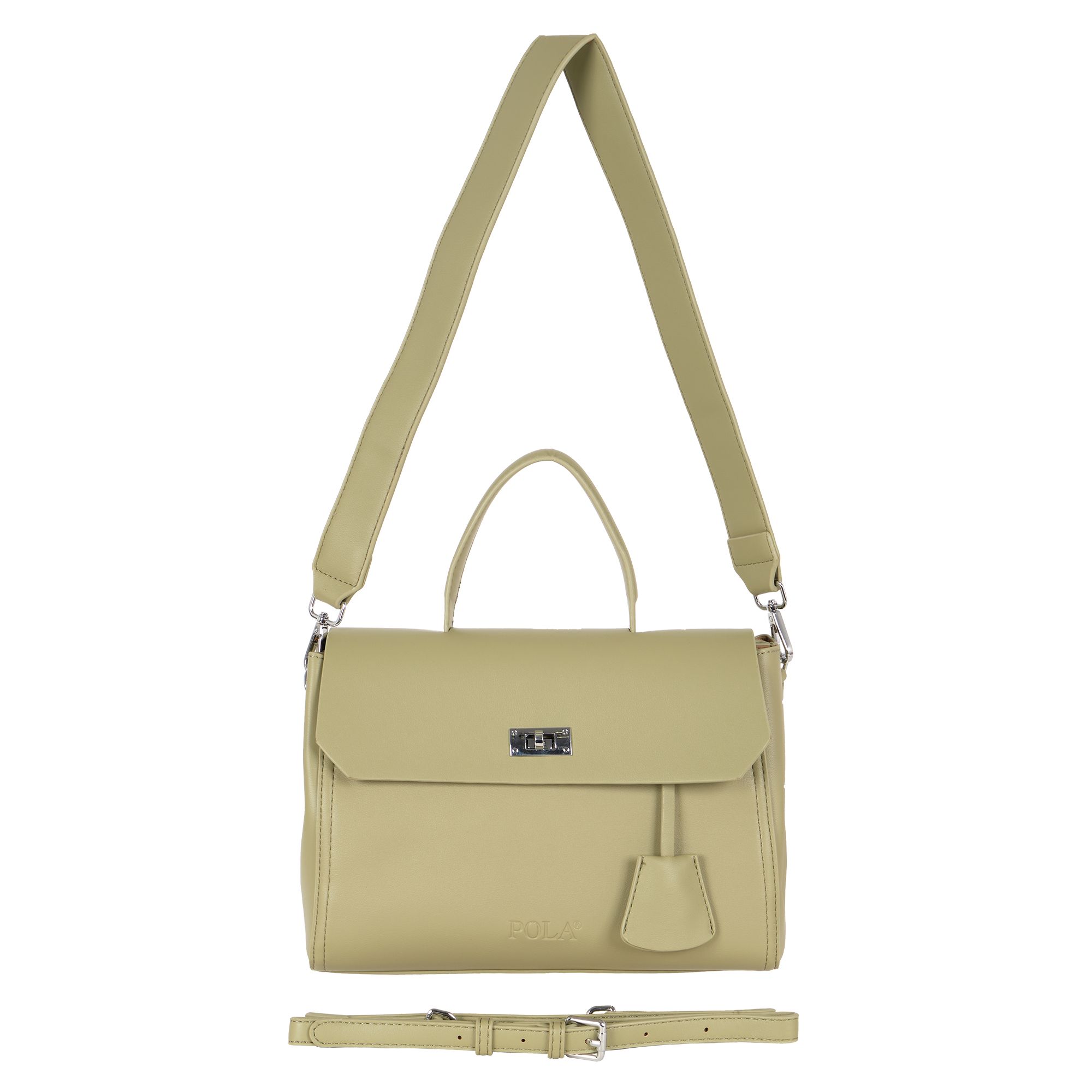 Элегантная сумка Pola выполнена из экокожи. Сумка прекрасно подойдёт женщинам, которые предпочитают деловой стиль. Сумка состоит из одного основного отделения, которое закрывается клапаном на поворотный металлический замок. Внутри основного отделения есть кармашек на молнии и один открытый карман. Сзади сумки присутствует маленький карман на молнии.  У сумки есть ручка для переноски, высота которой 9 см и два съемных ремешка, один тонкий 117 см и 77см второй ремешок шириной 3,5 см. Цвет фурнитуры-серебро.