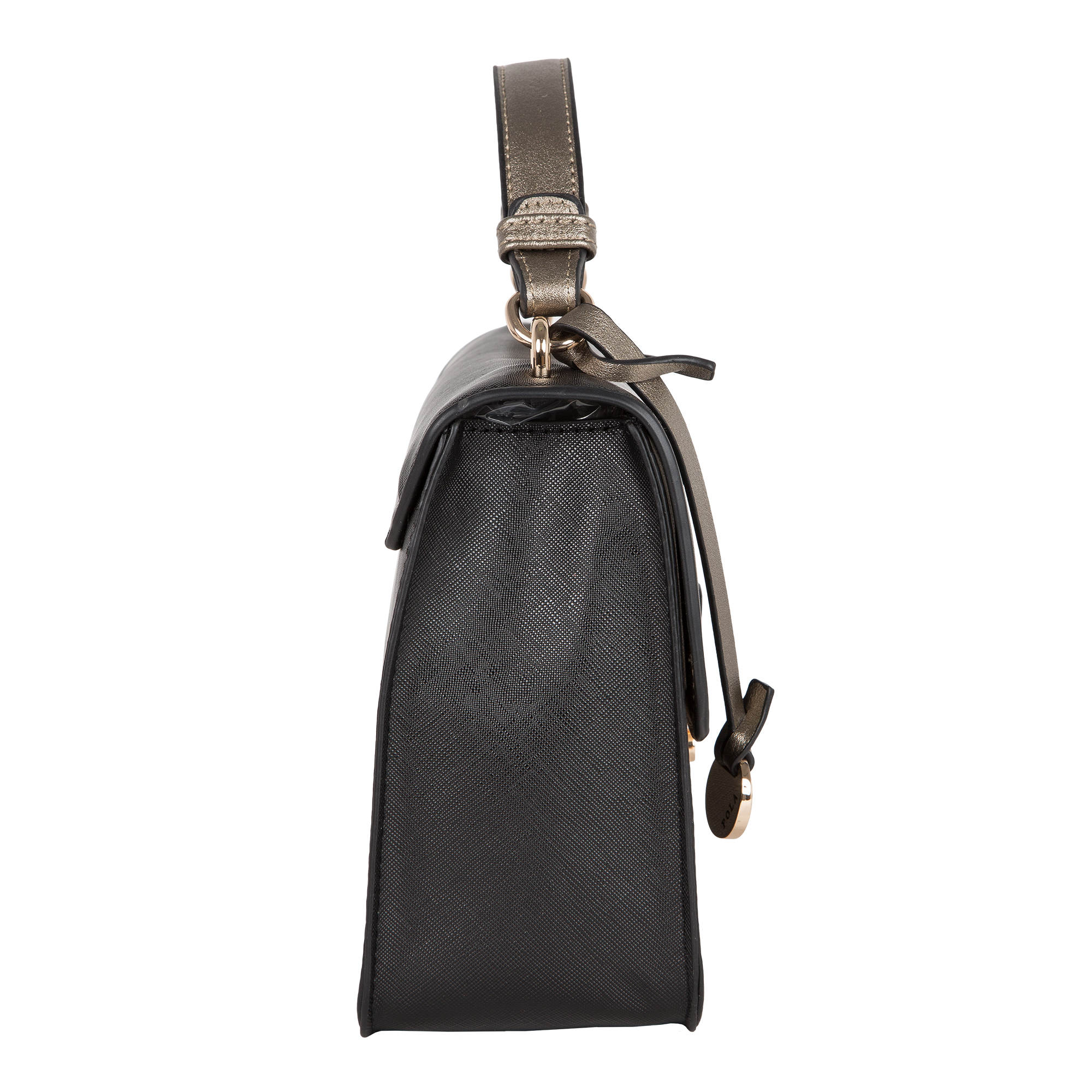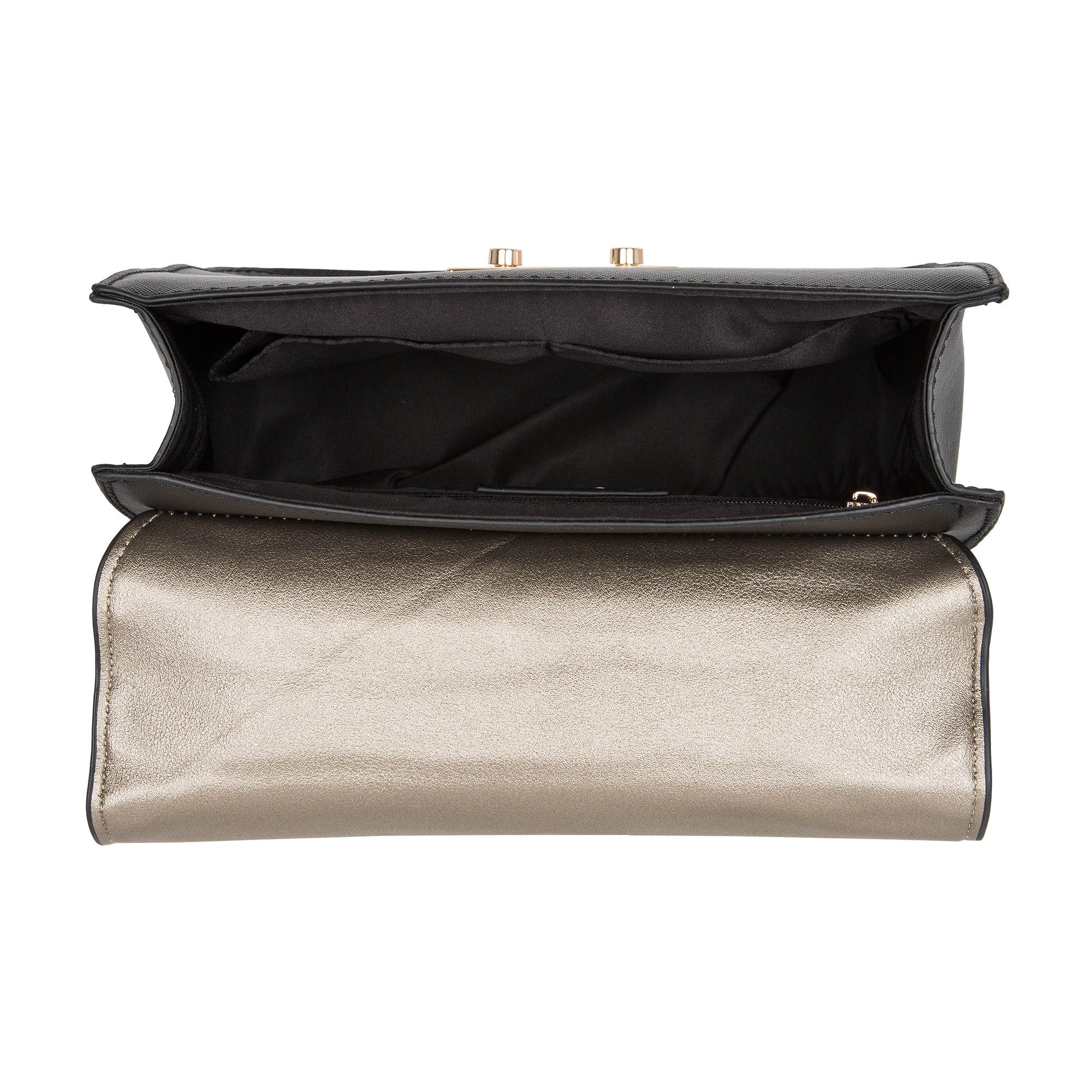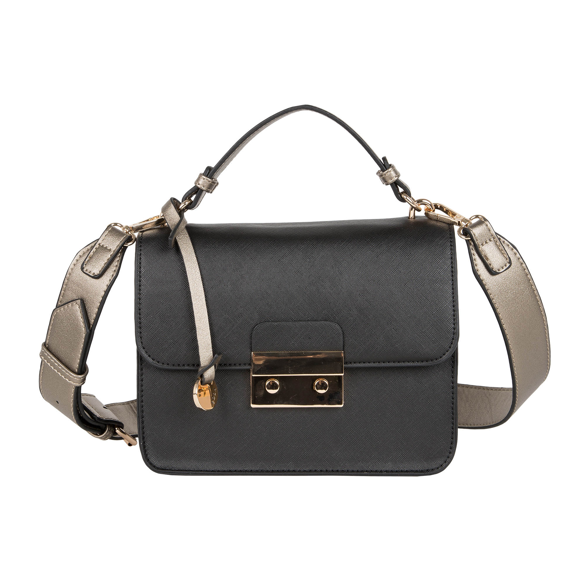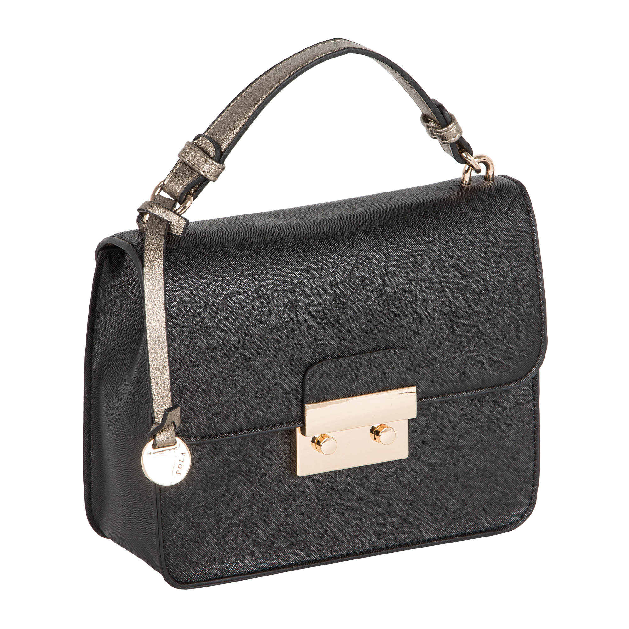 Миниатюрная женская сумка Pola выполнена из экокожи, представлена в актуальных классических расцветках и прекрасно подходит как для ежедневного использования, так и для выхода в свет. Особенностью данной модели является то, что ручка для переноски и съёмный, регулируемый ремень выполнены в бронзовом, контрастном основному, цвете. Основное отделение закрывается клапаном с помощью металлического замка-защёлки, который в свою очередь выступает в качестве полноценного декоративного элемента. Данную модель можно носить как в руках, так и на плече с помощью съёмного, регулируемого ремня. Цвет фурнитуры - золото. Высота ручки для переноски составляет 8см, длина ремня- 80 см.