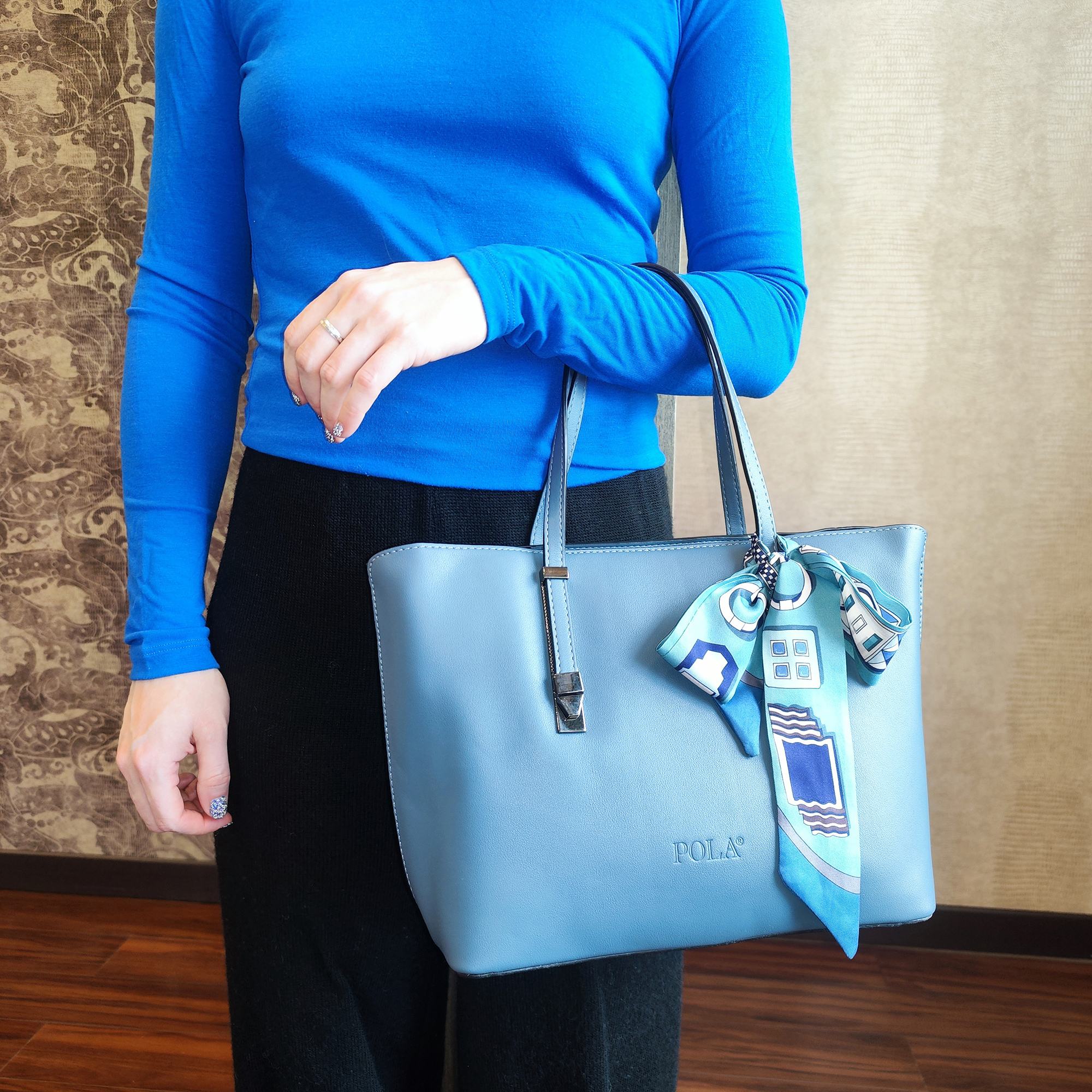 Стильная женская сумка-тоут фирмы Pola выполнена из экокожи и предназначена для повседневного использования. Основное отделение закрывается на металлическую молнию и разделено кармашком на молнии на два отделения. Внутри сумочки есть маленький карман на молнии и два открытых. Отличительной особенностью данной модели является наличие с двух сторон боковых отделений в виде карманов на магнитной кнопке. У сумки есть ручки для переноски, высота которых составляет 19 см их можно украсить платком и два съёмных, ремешка, один из экокожи тонкий регулируемый длина которого- 121 см и 87 см второй ремешок из текстиля. Цвет фурнитуры-черный.
