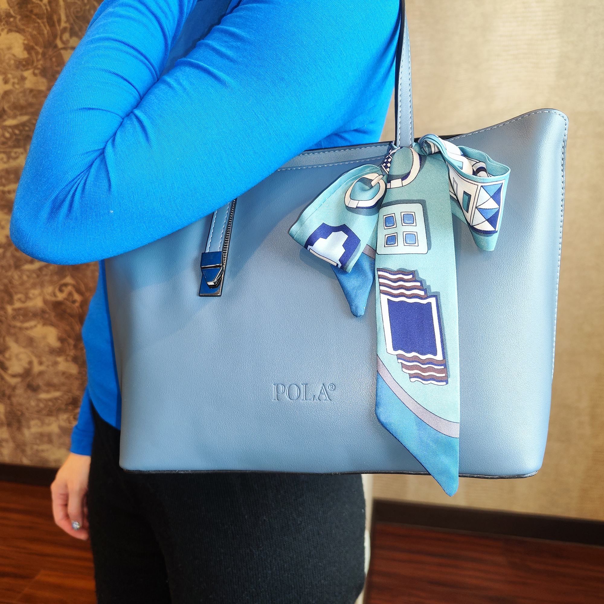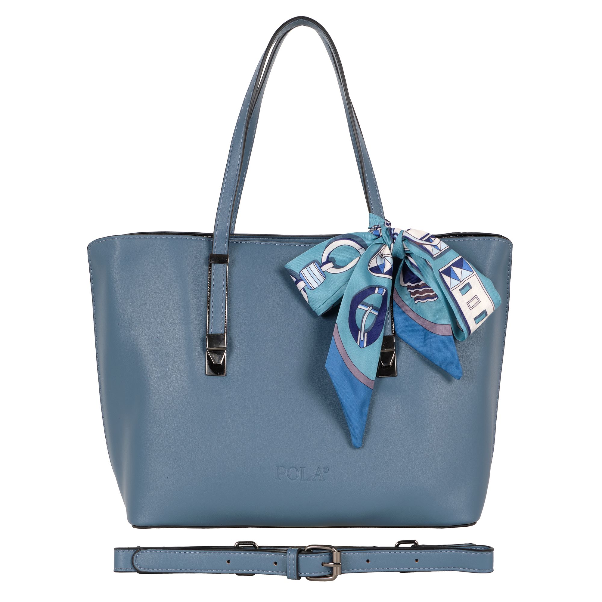 Стильная женская сумка-тоут фирмы Pola выполнена из экокожи и предназначена для повседневного использования. Основное отделение закрывается на металлическую молнию и разделено кармашком на молнии на два отделения. Внутри сумочки есть маленький карман на молнии и два открытых. Отличительной особенностью данной модели является наличие с двух сторон боковых отделений в виде карманов на магнитной кнопке. У сумки есть ручки для переноски, высота которых составляет 19 см их можно украсить платком и два съёмных, ремешка, один из экокожи тонкий регулируемый длина которого- 121 см и 87 см второй ремешок из текстиля. Цвет фурнитуры-черный.