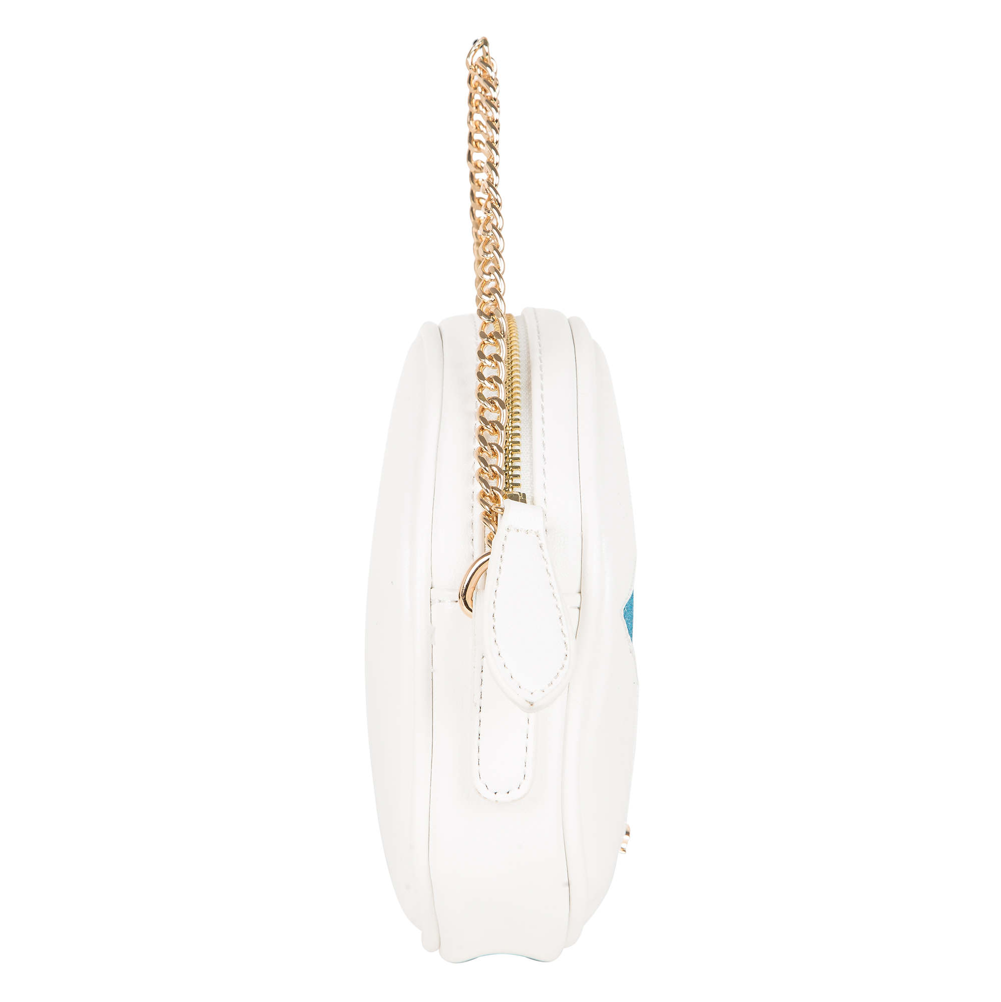 Ультрамодная, миниатюрная сумка абсолютно круглой формы Pola выполнена из экокожи и великолепно подходит как для создания вечернего образа, так и и для повседневного использования модницами. Данная модель по центру декорирована крупной яркой звездой различной цветовой гаммы. Сумочка закрывается на металлическую молнию. Особую изысканность данной сумке придаёт ручка- цепочка, в комплект входит съёмный регулируемый ремень, длина которого составляет 116 см. Цвет фурнитуры-золото.