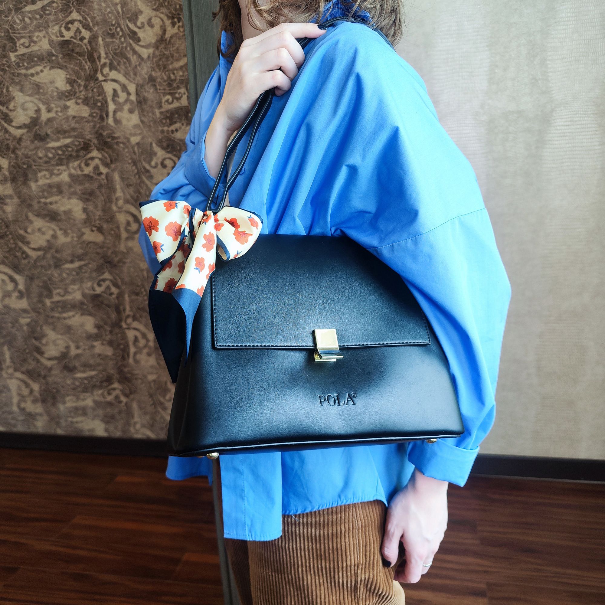 Стильная женская сумка фирмы Pola выполнена из экокожи и украшена платком. Основное отделение закрывается на клапан с помощью металлического замка-защелки и металлическую молнию. Внутри сумки есть маленький карман на молнии и один открытый. Сумка прекрасно подойдёт для повседневной носки. У сумки есть регулируемая ручка для переноски, высота которой составляет 45 см их можно украсить платком. Есть тонкий регулируемый ремешок длина которого- 121 см. Цвет фурнитуры-золото.