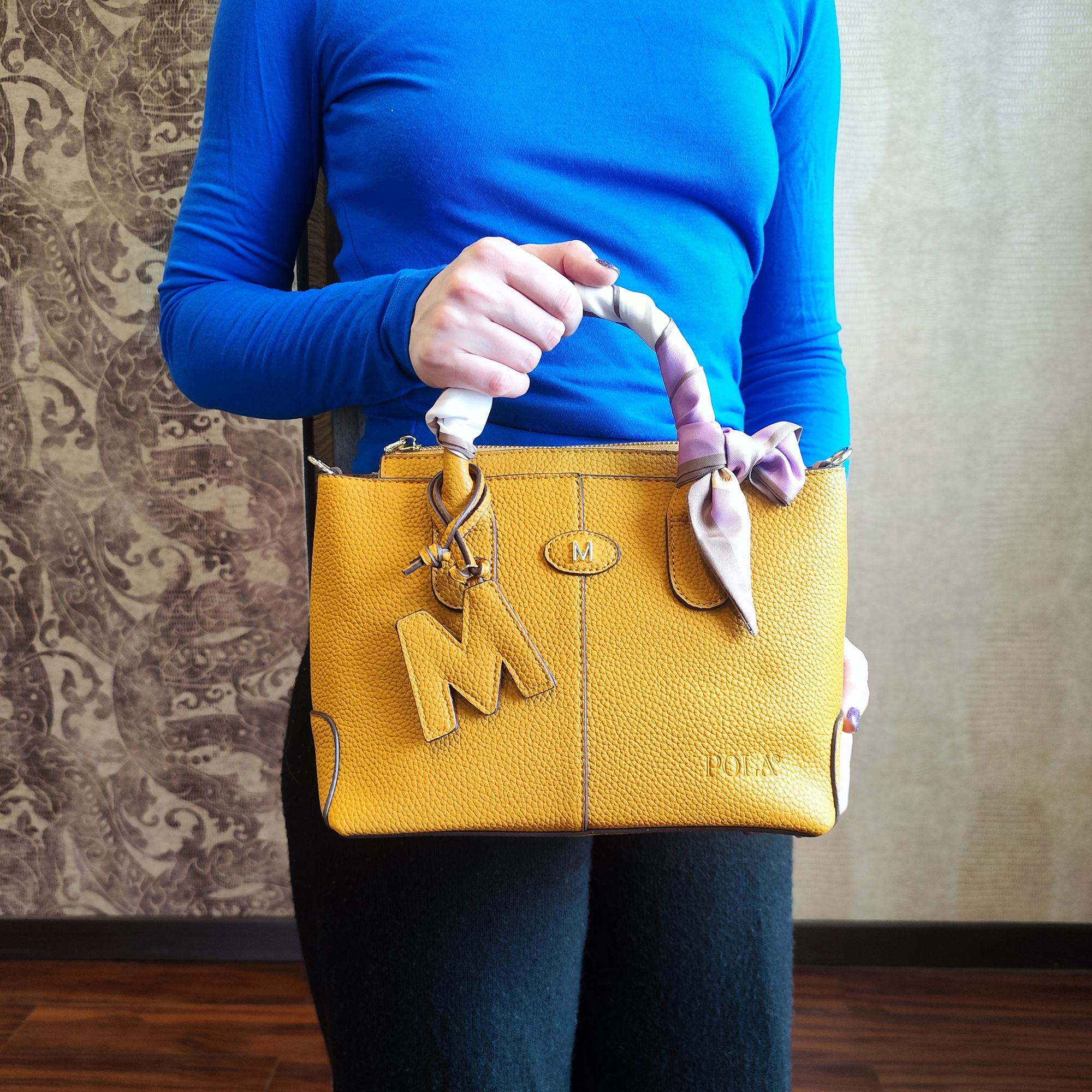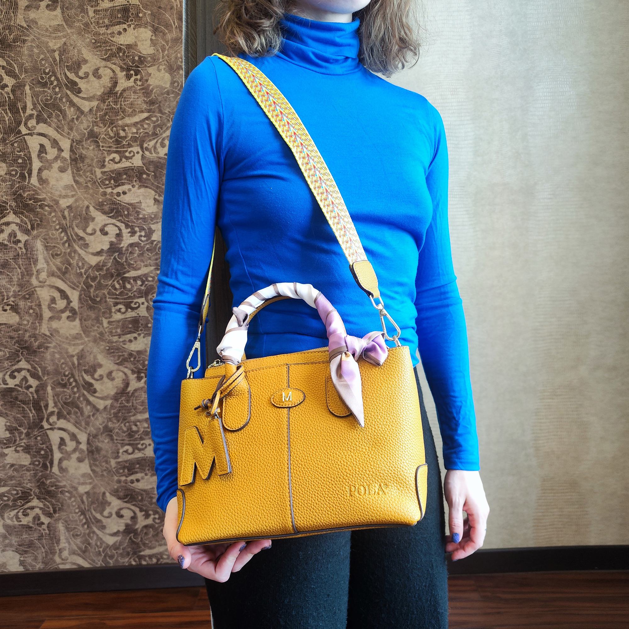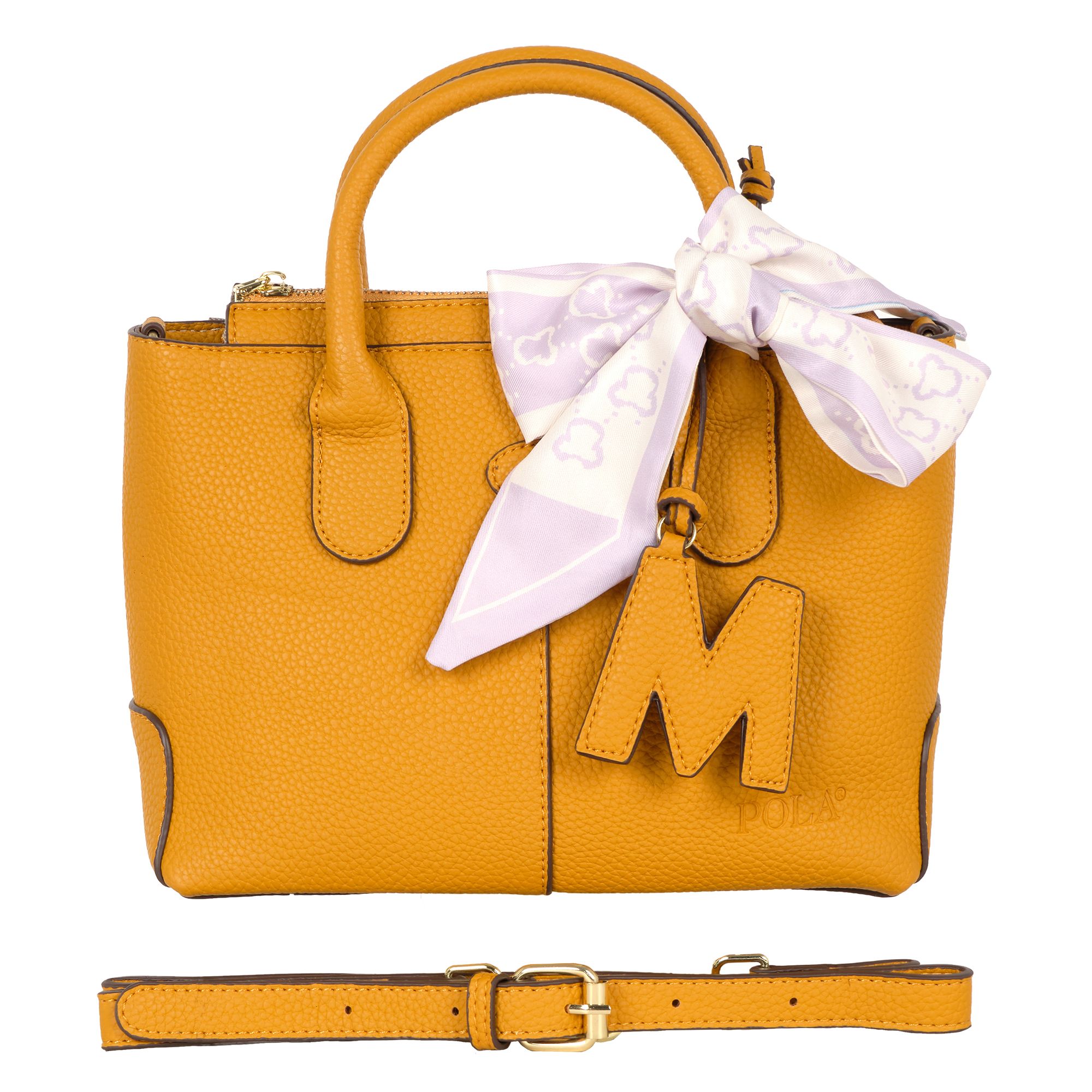 Стильная женская сумка фирмы Pola выполнена из экокожи и украшена брелоком. Основное отделение закрывается на металлическую молнию. Внутри сумочки есть маленький карман на молнии и два открытых. Сумка прекрасно подойдёт для повседневной носки. У сумки есть ручки для переноски, высота которых составляет 10 см их можно украсить платком и два съёмных, ремешка, один из экокожи тонкий регулируемый длина которого- 121 см и 87 см второй ремешок из текстиля. Цвет фурнитуры-золото.