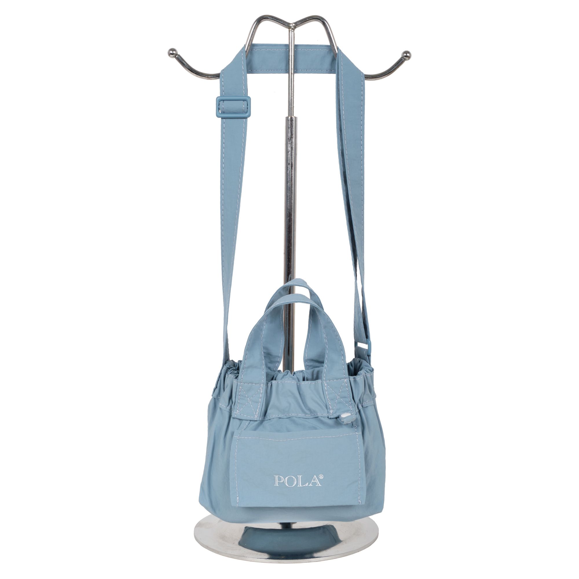 Сумка-шоппер фирмы  POLA выполнена из текстиля. Основное отделение закрывается на металлическую кнопку. Внутри одно отделение. Спереди маленький карман для мелочей. Длина ручек 14 см. Сумку можно носить на плече за счет регулируемого ремня максимальная длина 97 см.